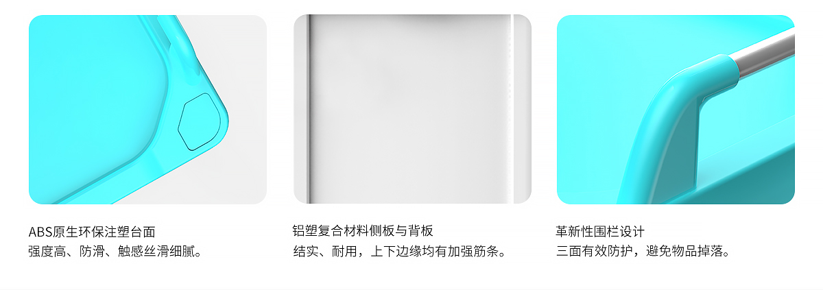 2.革新性圍欄設計,不銹鋼圓管搭配塑膠件,三面防護有效防止物品掉落;