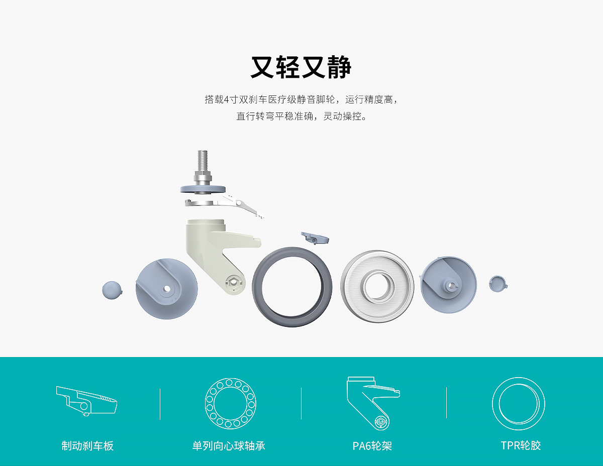 13.搭載4寸雙剎車醫療級靜音腳輪,PA6材質輪架,優于十倍鋼制結構同品;單列向心球軸承,運行精度高,直行轉彎平穩準確;