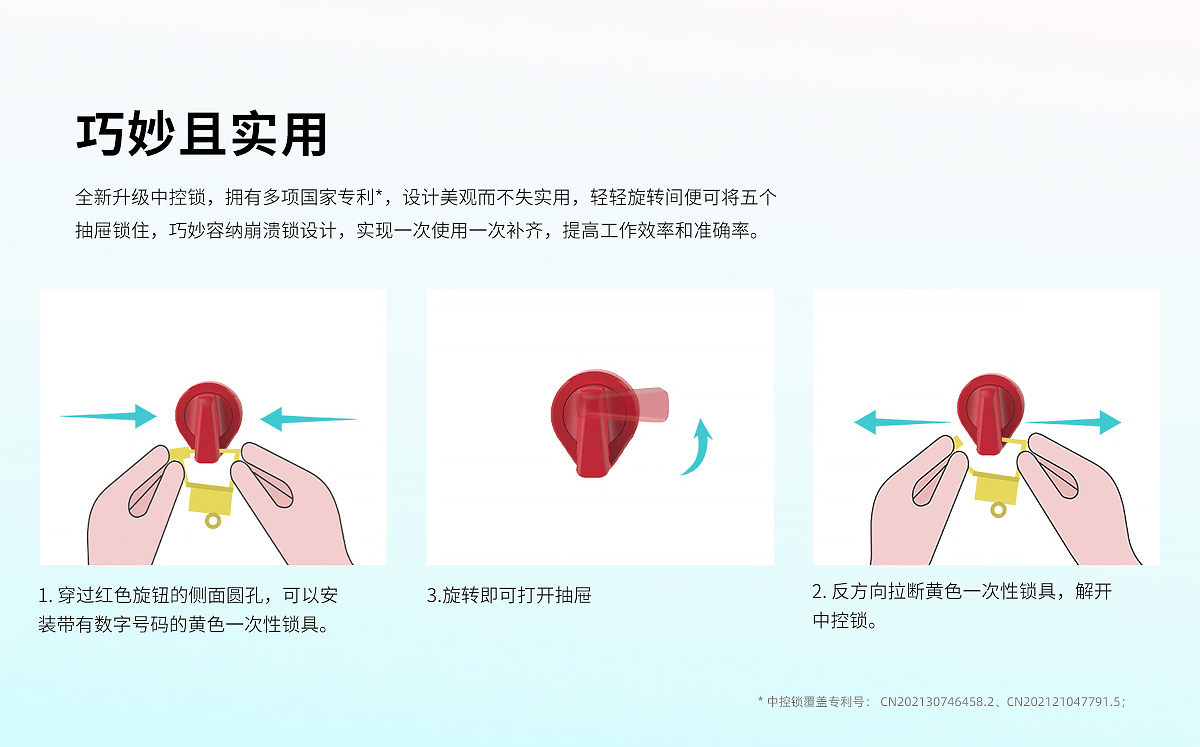 8.一次性中控鎖控,輕輕旋轉間便可將五抽屜鎖住,實現一次使用一次補齊,提高工作效率和準確率;