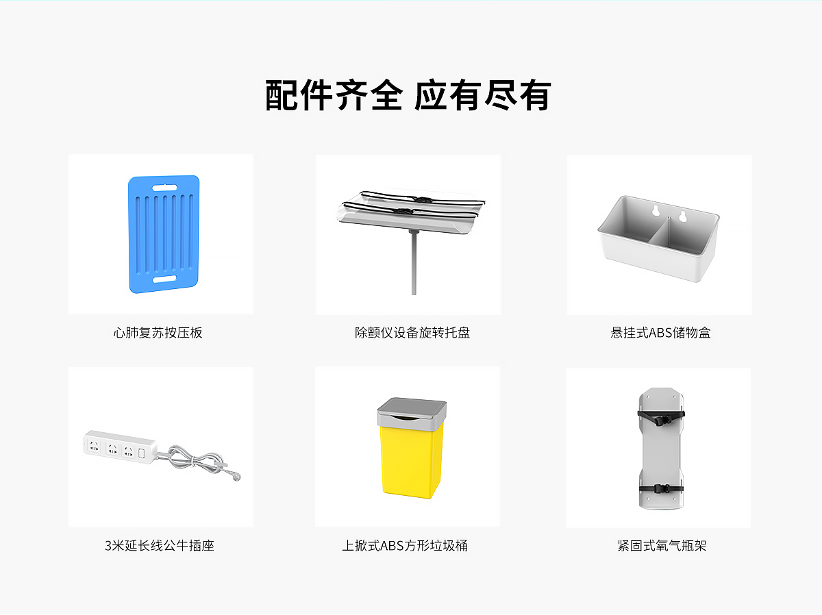 11.左側懸掛式ABS儲物盒,中間有自由分隔插片,上掀式ABS方形垃圾桶,可輕松摘離;右側配備氧氣瓶固定架;