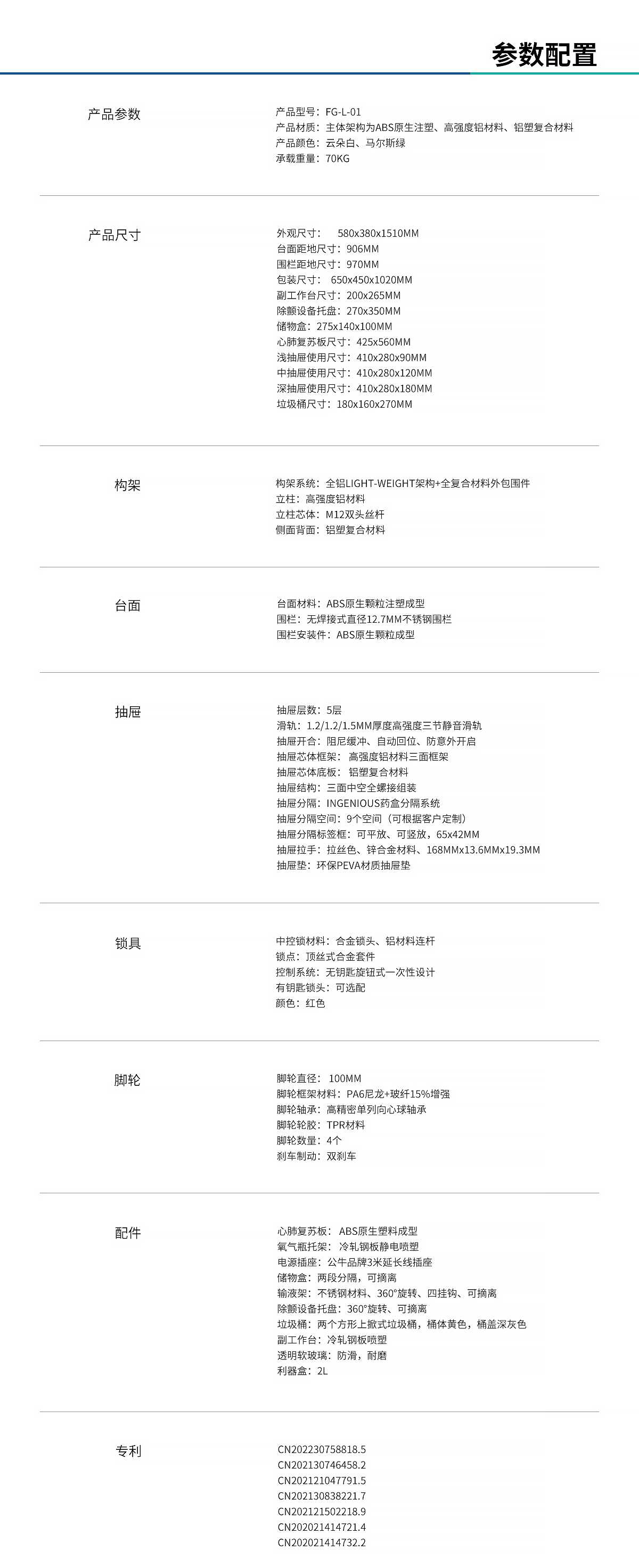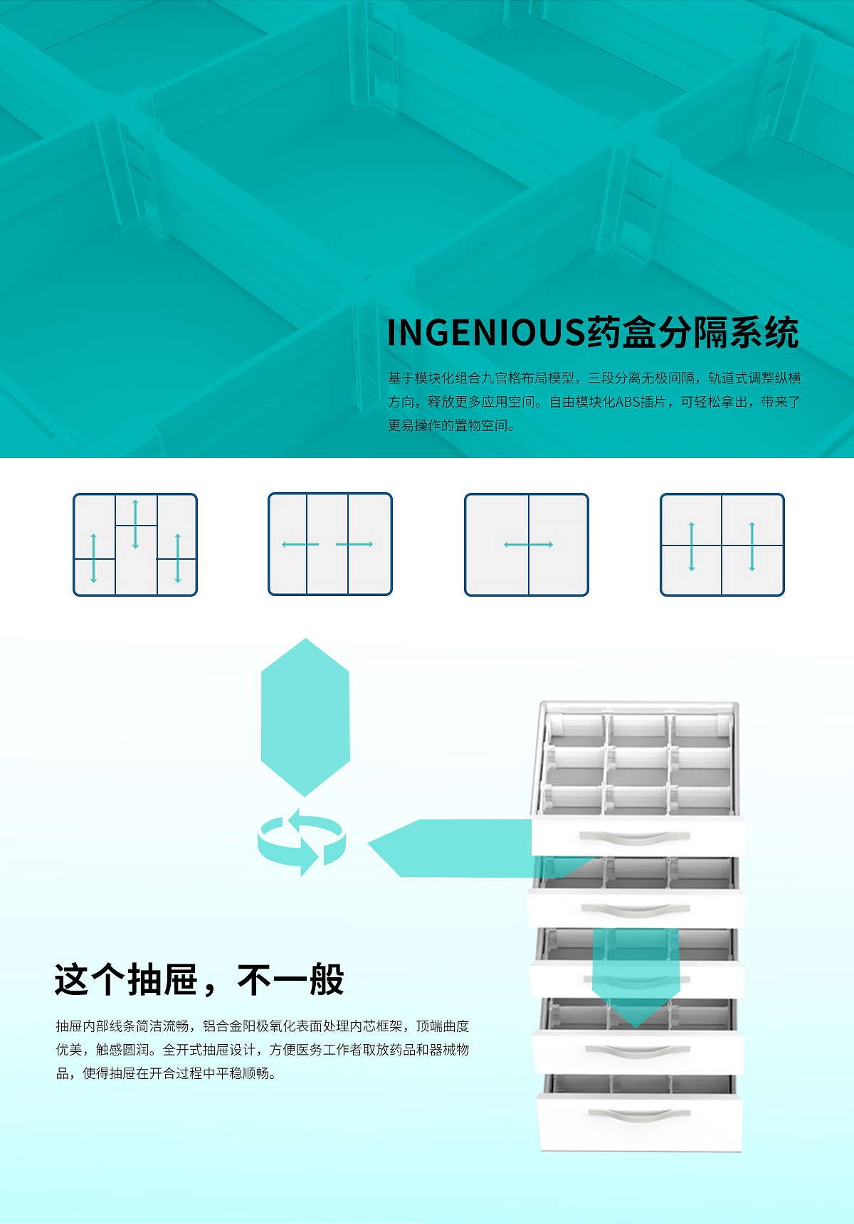 7.五層抽屜設計,三層淺抽屜高度105MM,中抽屜高度135MM,深抽屜高度195MM,標配Ingenious藥盒分隔系統,基于九宮格布局模型,三層分離無極間隔,釋放更多空間;
