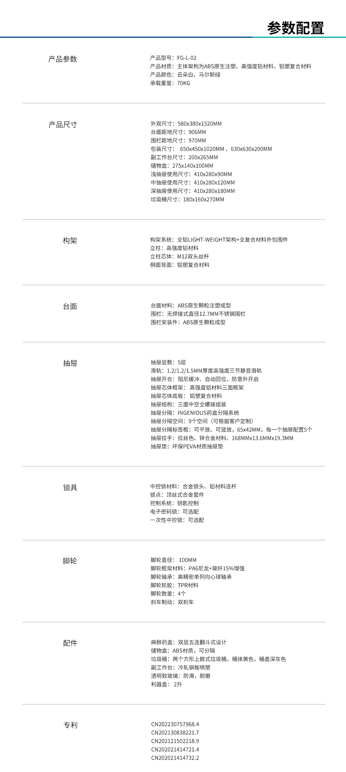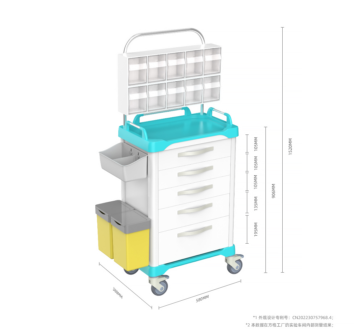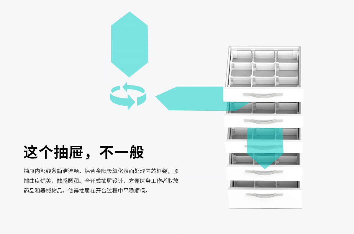 7.五層抽屜設計,三層淺抽屜高度105MM,中抽屜高度135MM,深抽屜高度195MM,標配Ingenious藥盒分隔系統,基于九宮格布局模型,三層分離無極間隔,釋放更多空間;