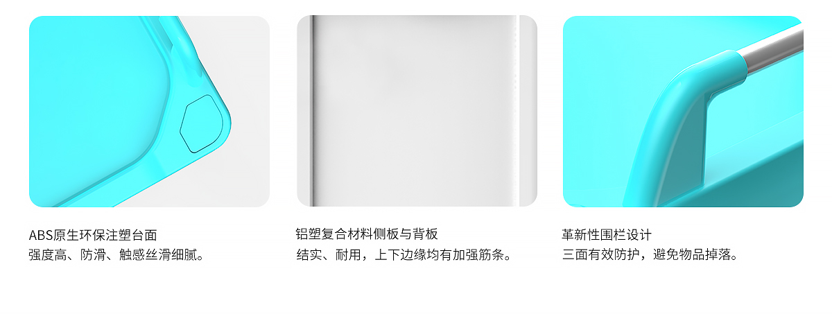 2.革新性圍欄設計,不銹鋼圓管搭配塑膠件,三面防護有效防止物品掉落;