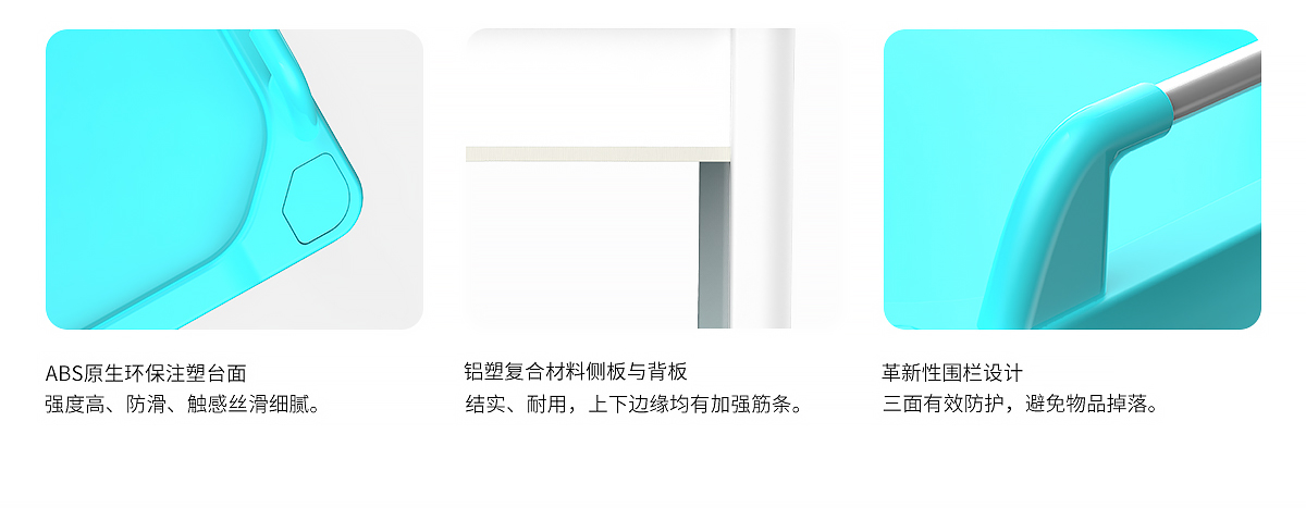 2.革新性圍欄設計,不銹鋼圓管搭配塑膠件,三面防護有效防止物品掉落;