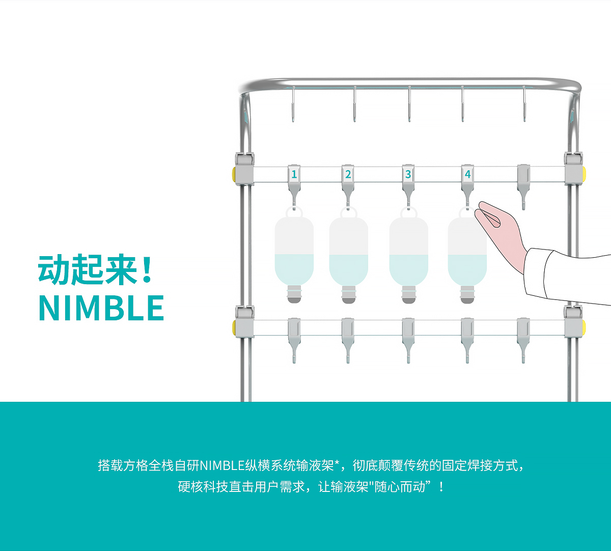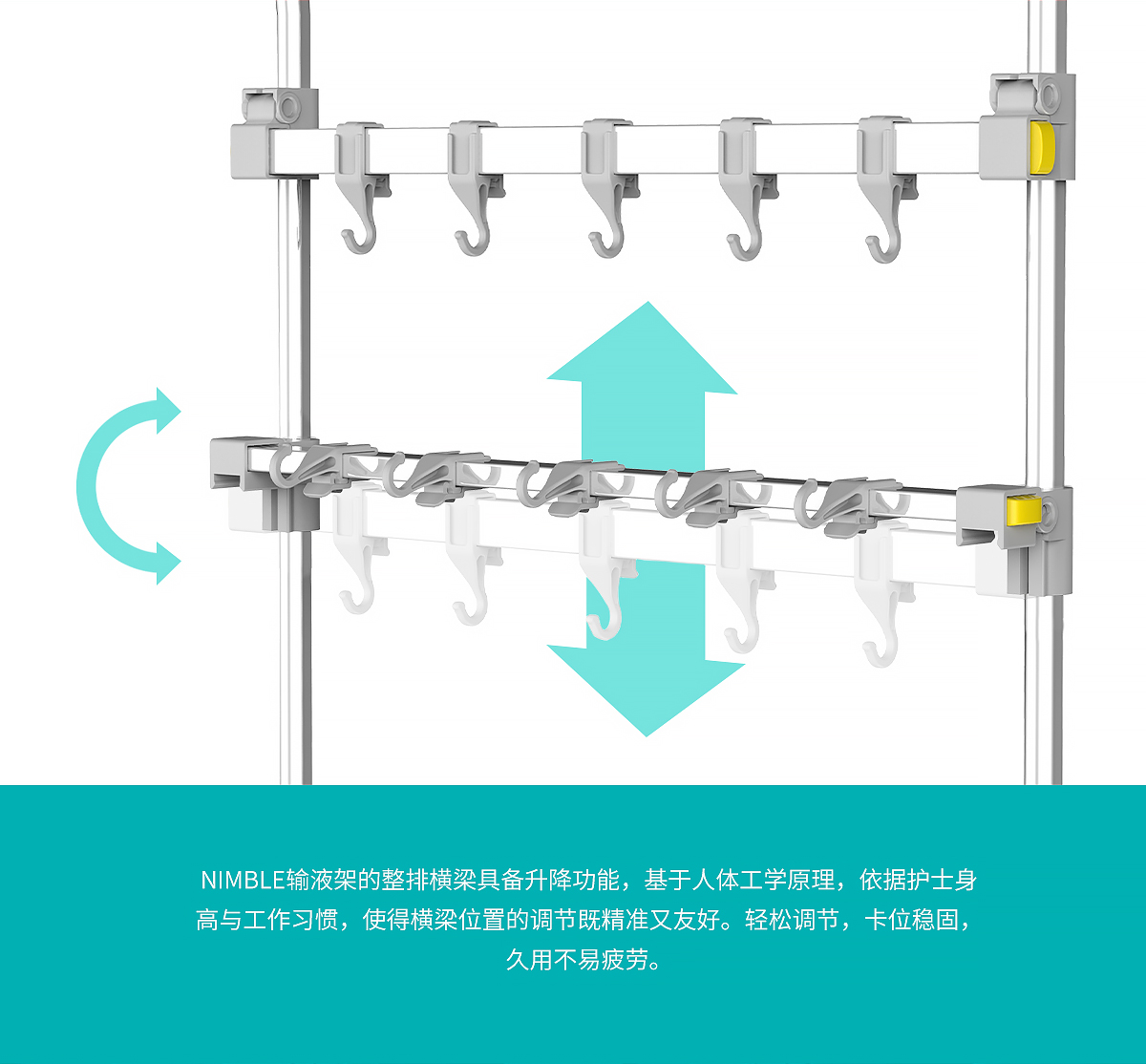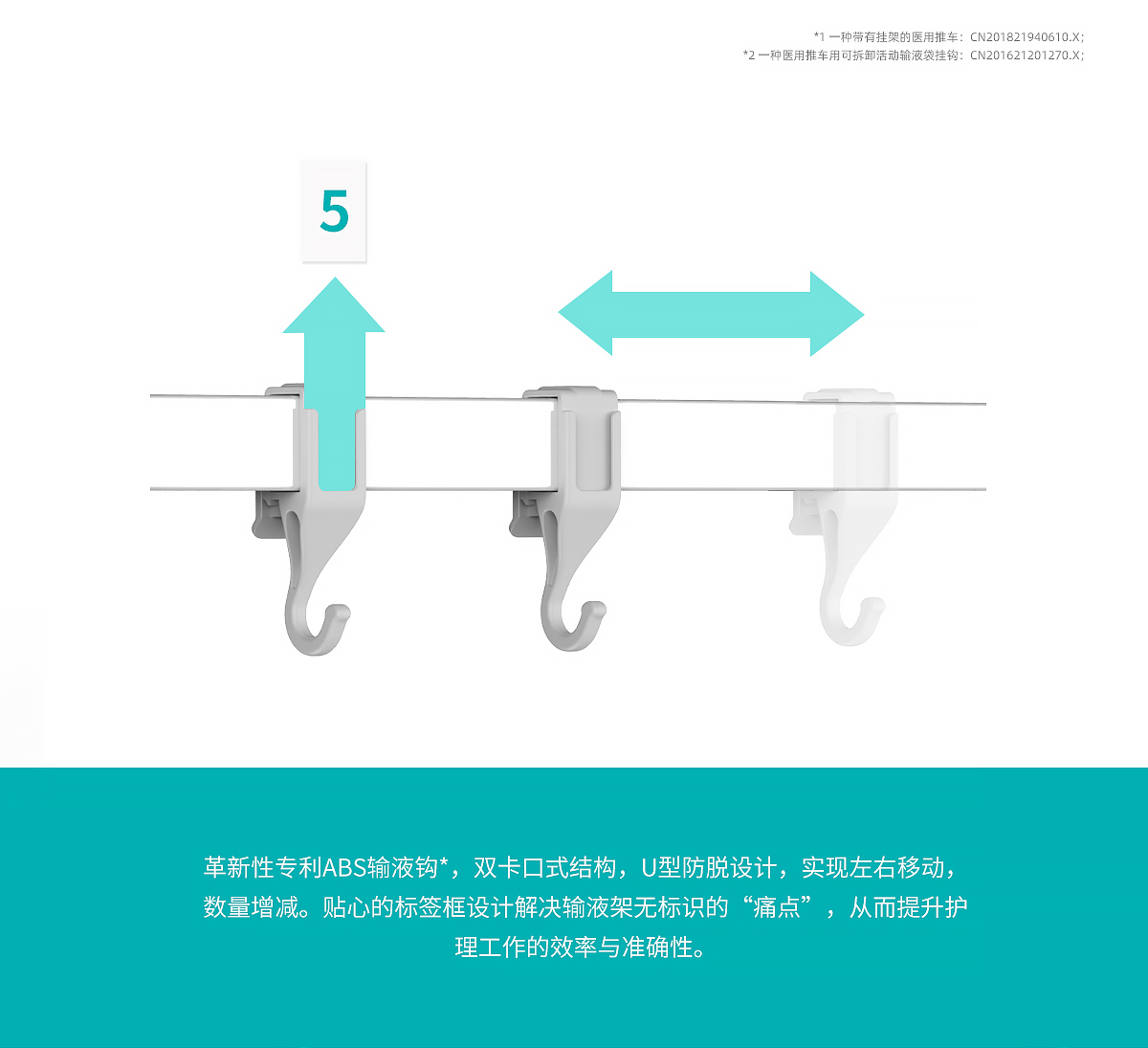 9.三排不銹鋼輸液架,雙排可升降定位;單個設有標識框的ABS輸液鉤,可移動增減;