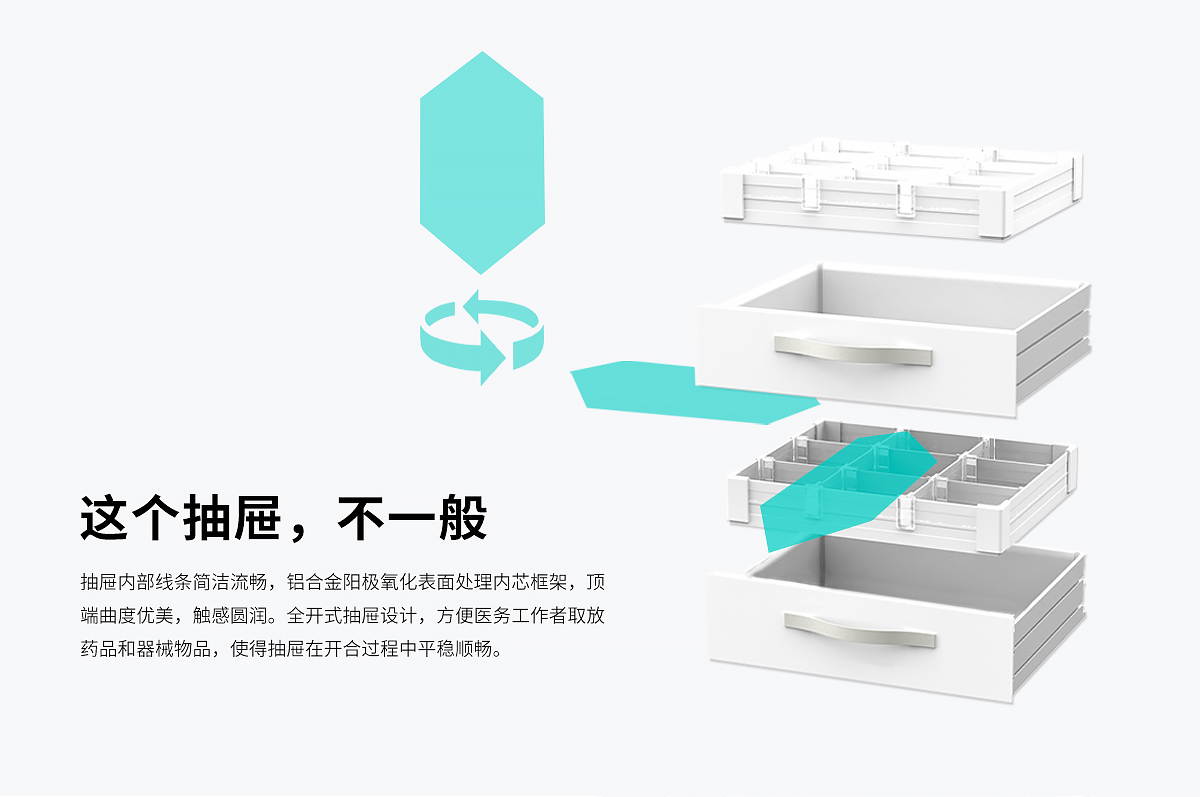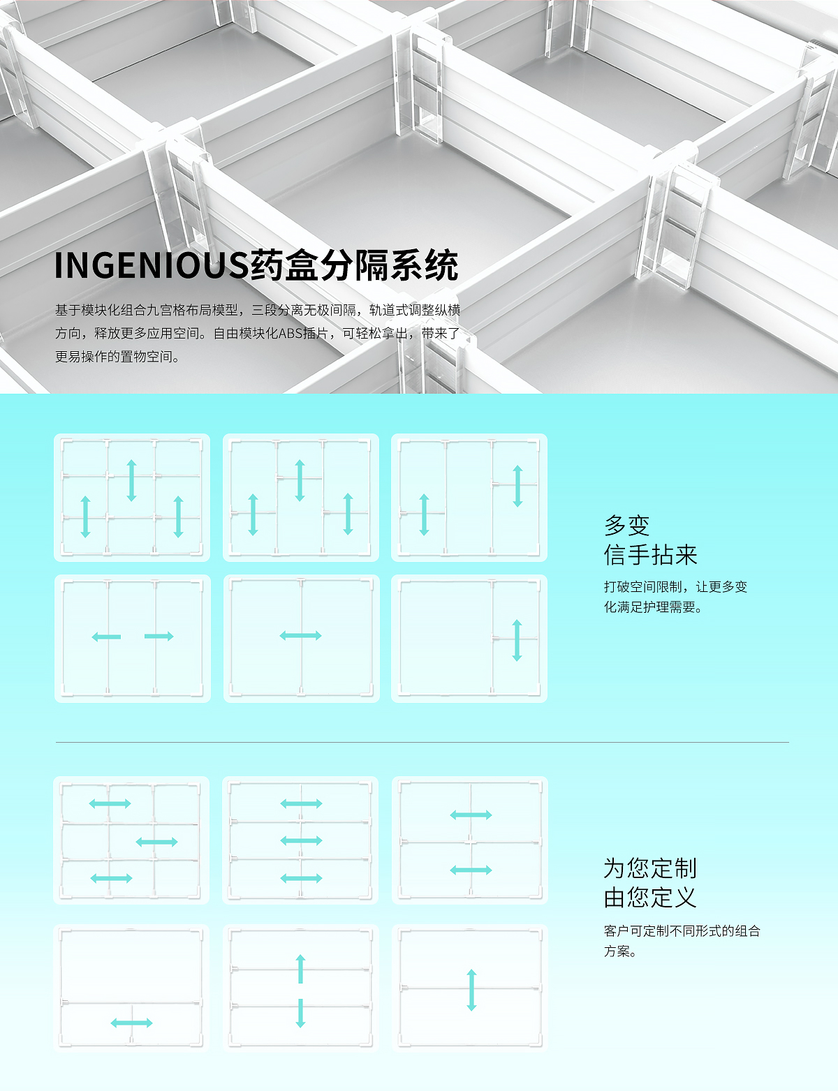 7.雙層抽屜設計,每層高度105MM,標配Ingenious藥盒分隔系統,基于九宮格布局模型,三層分離無極間隔,釋放更多空間;