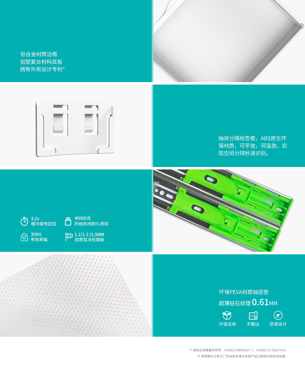 8.抽屜選用1.2/1.2/1.5MM加厚型三節靜音滑軌,防意外開啟設計,內置阻尼器3.2s緩沖柔性回位,有效承載30KG;