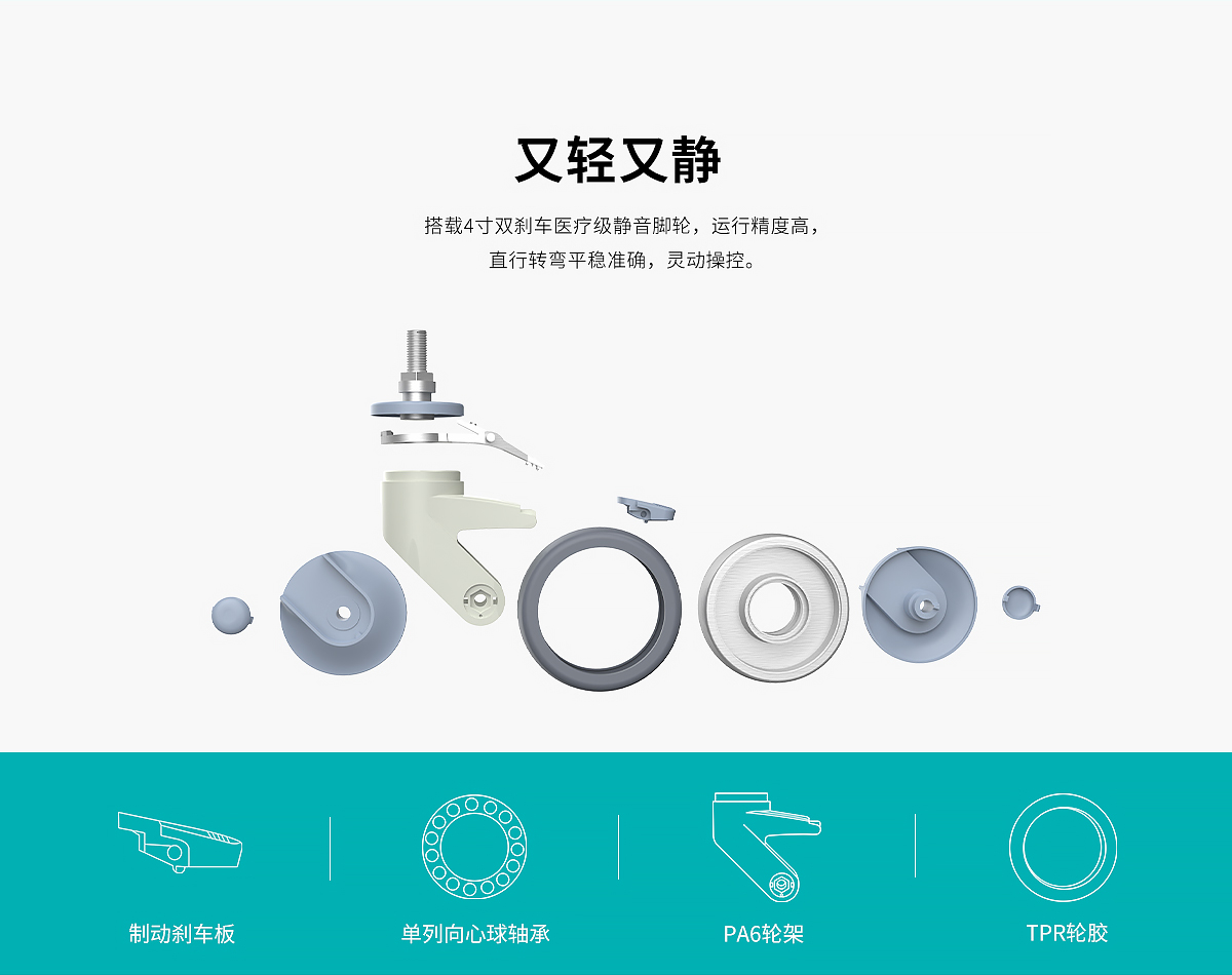 11.搭載4寸雙剎車醫療級靜音腳輪,PA6材質輪架,優于十倍鋼制結構同品;單列向心球軸承,運行精度高,直行轉彎平穩準確;