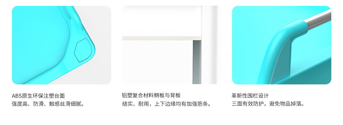 2.革新性圍欄設計,不銹鋼圓管搭配塑膠件,三面防護有效防止物品掉落;