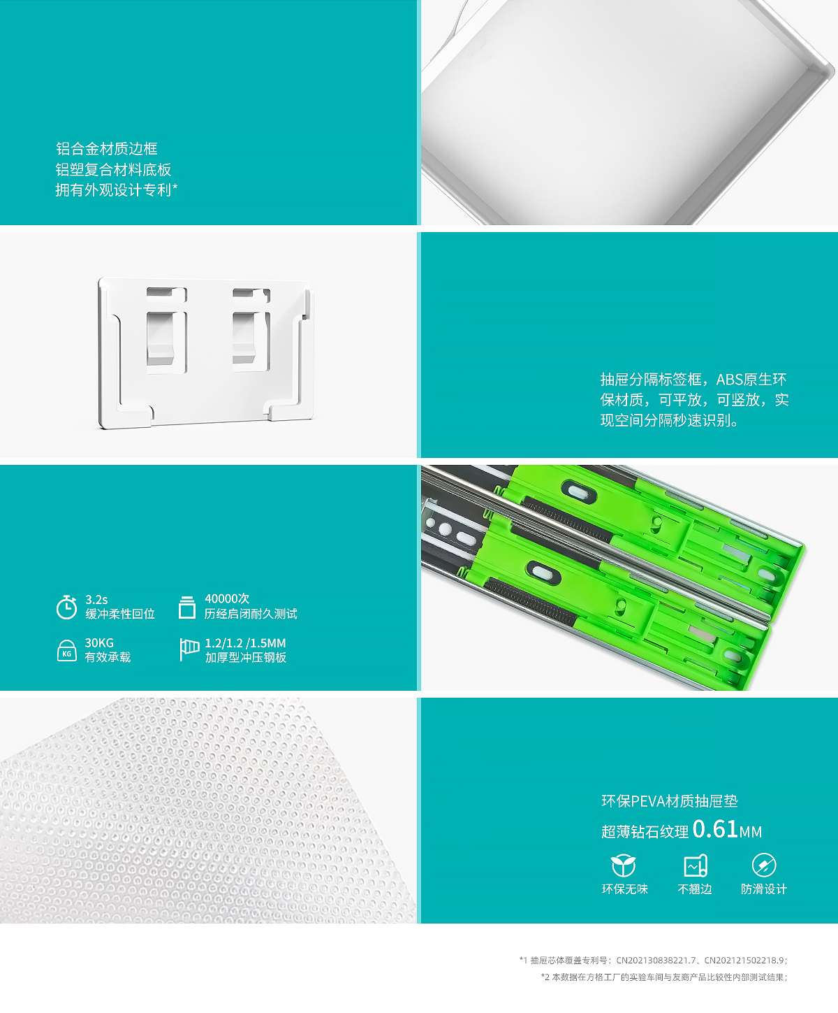8.抽屜選用1.2/1.2/1.5MM加厚型三節靜音滑軌,防意外開啟設計,內置阻尼器3.2s緩沖柔性回位,有效承載30KG;