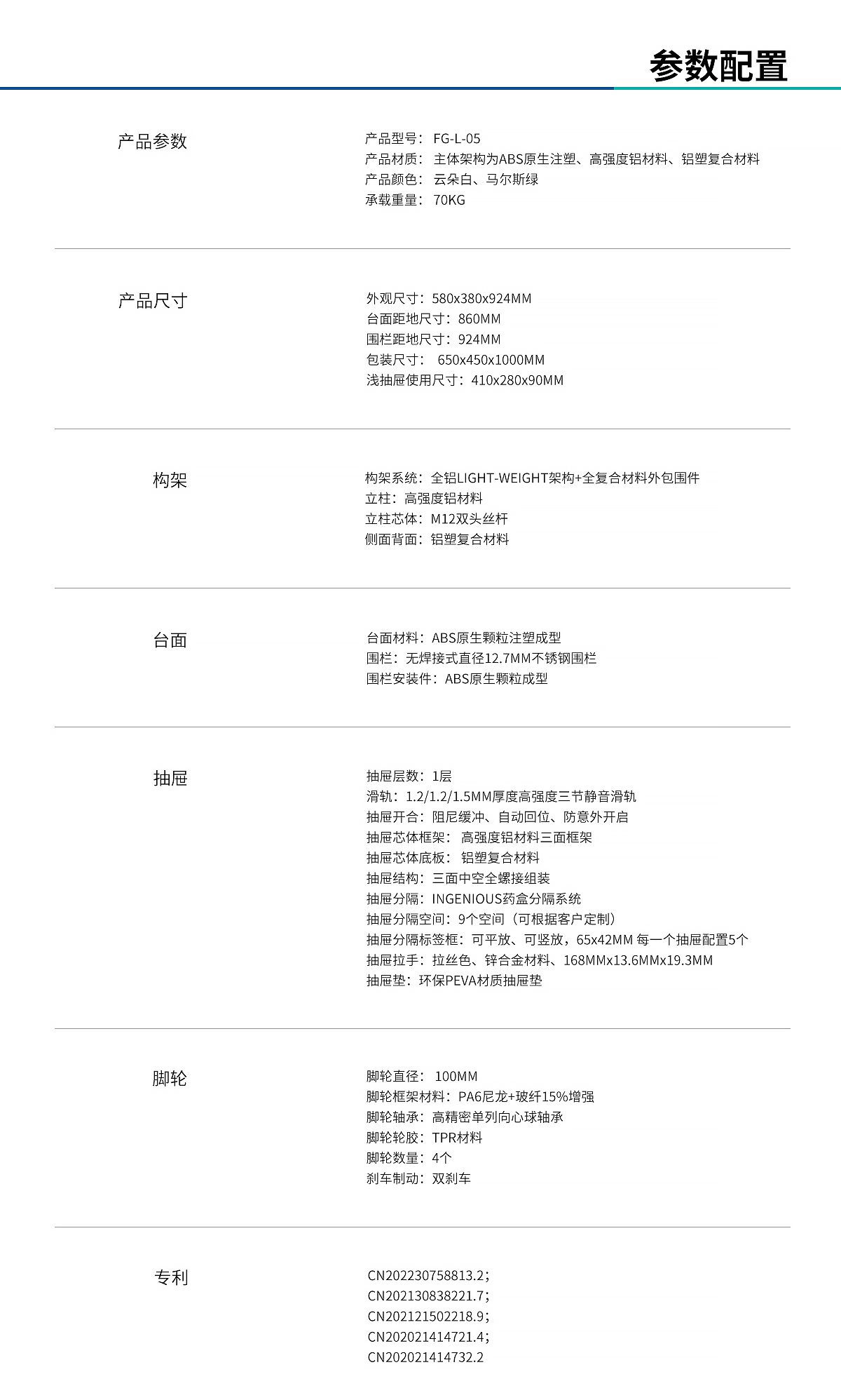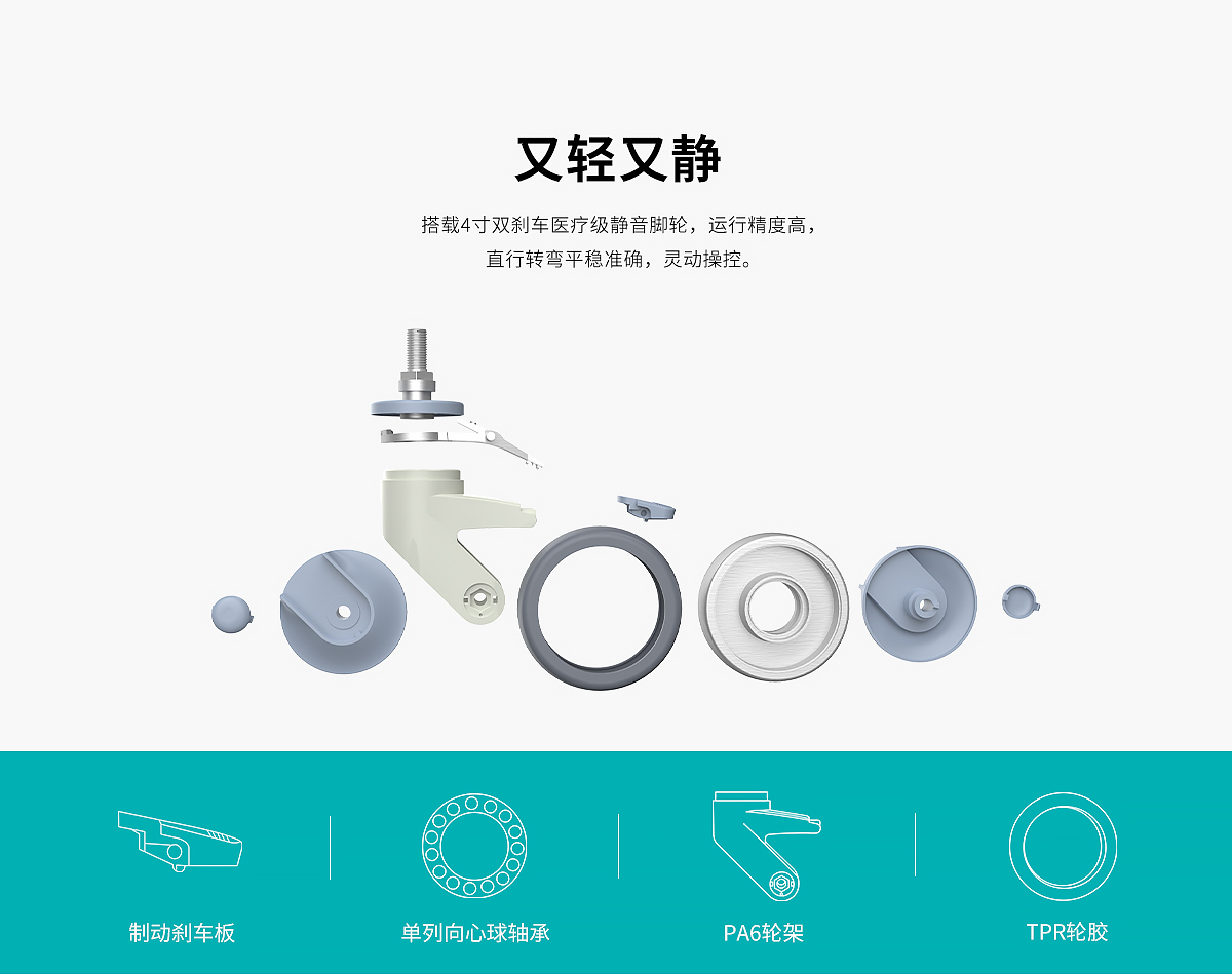 10.搭載4寸雙剎車醫療級靜音腳輪,PA6材質輪架,優于十倍鋼制結構同品;單列向心球軸承,運行精度高,直行轉彎平穩準確;
