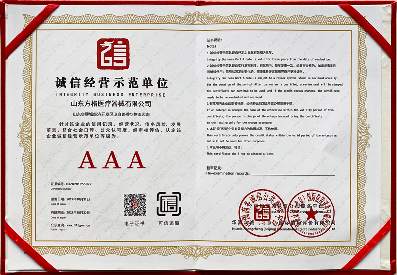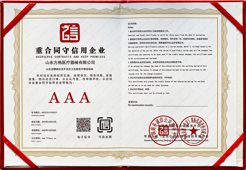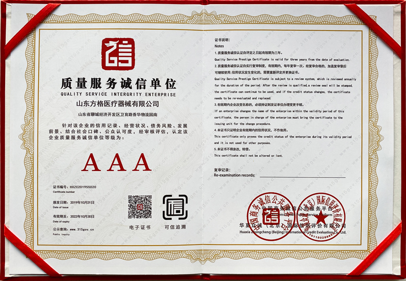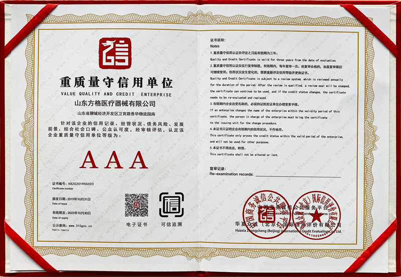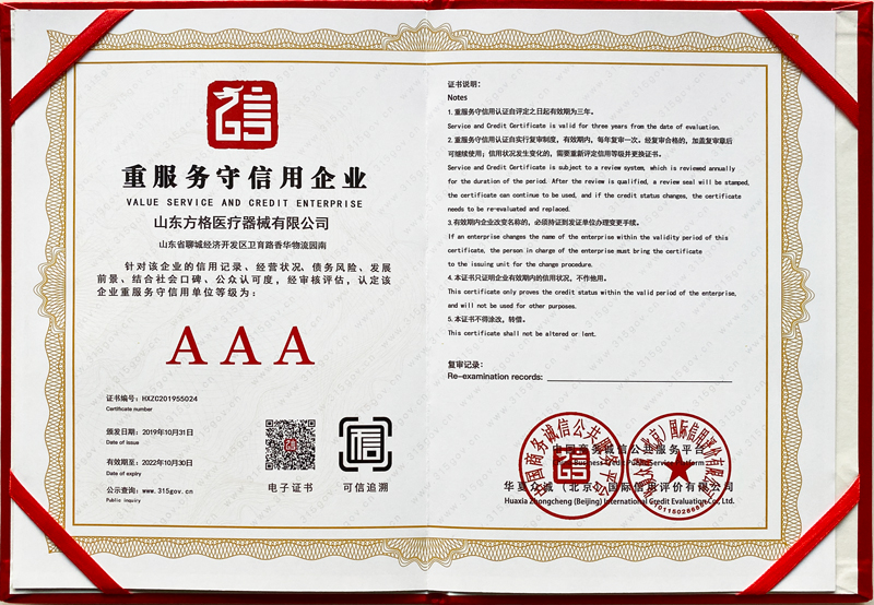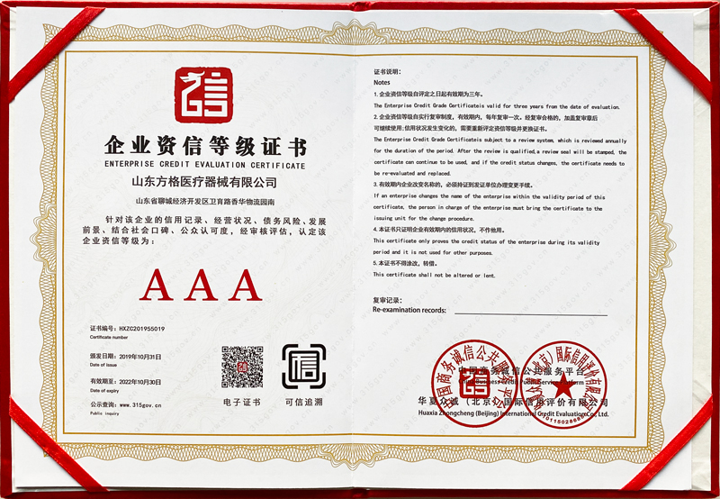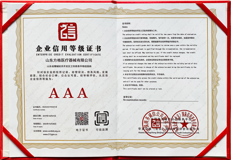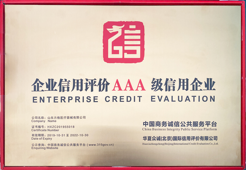 2019年11月,經第三方權威征信機構的嚴格審核評定,山東方格醫療器械有限公司成功獲得AAA級《企業信用等級證書》及信用等級牌匾。AAA級《企業信用等級證書》 是對方格公司實力和信譽的高度認可,是公司在健康發展過程中獲得的又一重要里程碑,這一資質對企業后續發展具有深遠的意義。
