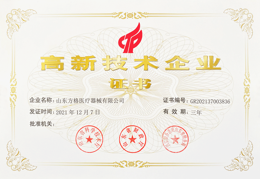 全國高新技術企業認定管理工作領導小組辦公室對山東省2021年認定的第一批高新技術企業備案名單予以公告,山東方格醫療器械有限公司位列其中,榮獲“國家高新技術企業”稱號。