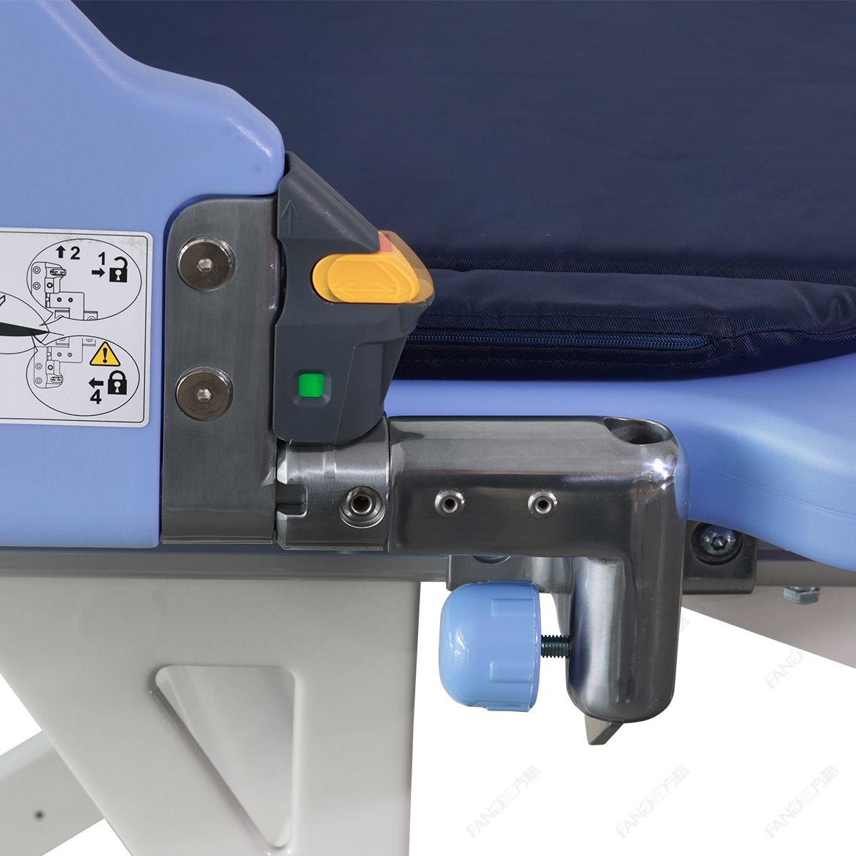 6.護欄板上設有角度顯示,方便護理時知道背部升起的角度;兩側護欄板中間有凹槽,防止導管滑落,方便輸液引流。鋁壓鑄一體成型護欄支架,強度更高,人性化,外觀更好;