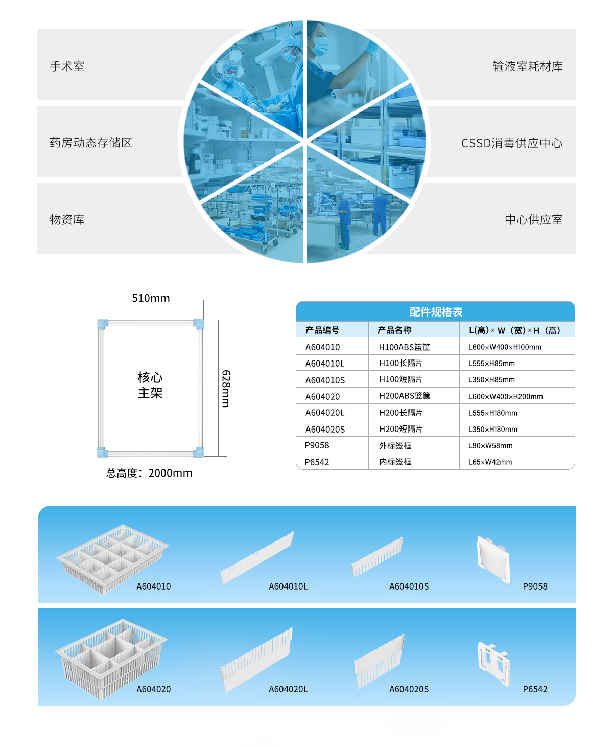適用于手術室(器械/耗材分類防菌存儲)、中心藥房(藥品動態分格管理)、急診科(快速定位取用)、靜配中心(高兼容跨平臺周轉)等場景,滿足無菌環境抗腐蝕、空間靈活重組及高效院感管控需求,適配多類型醫療空間精細化存儲布局。