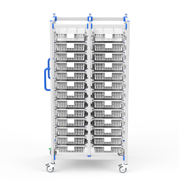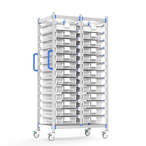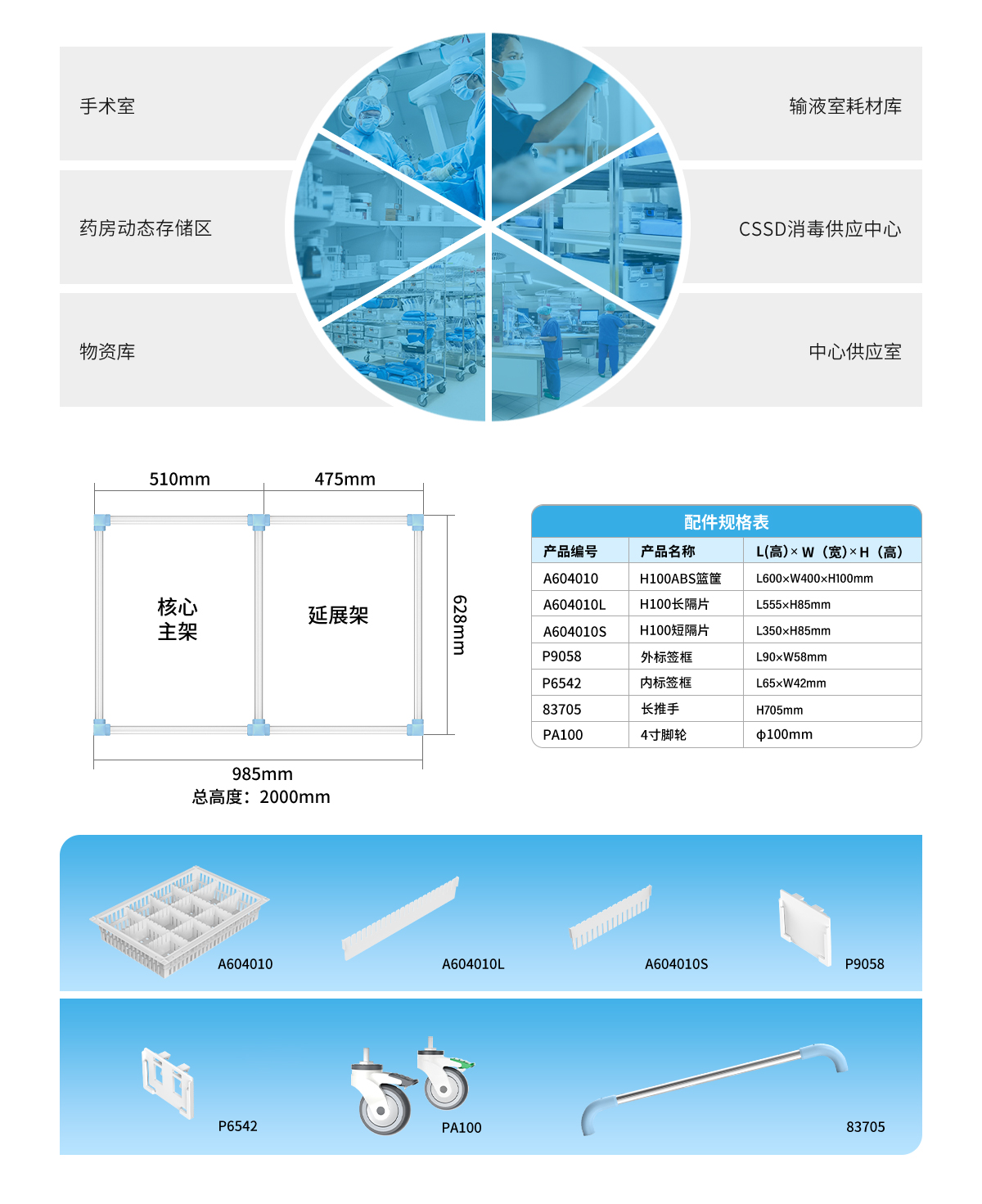 專為手術室(器械/耗材密集周轉)、中心供應室(無菌物資防菌存儲)、藥房(藥品高密度動態管理)、急診科(快速機動調配)設計,適配需高頻移動、精準定位及靜音平穩轉運的醫療場景,滿足院感管控與空間高效利用需求。
