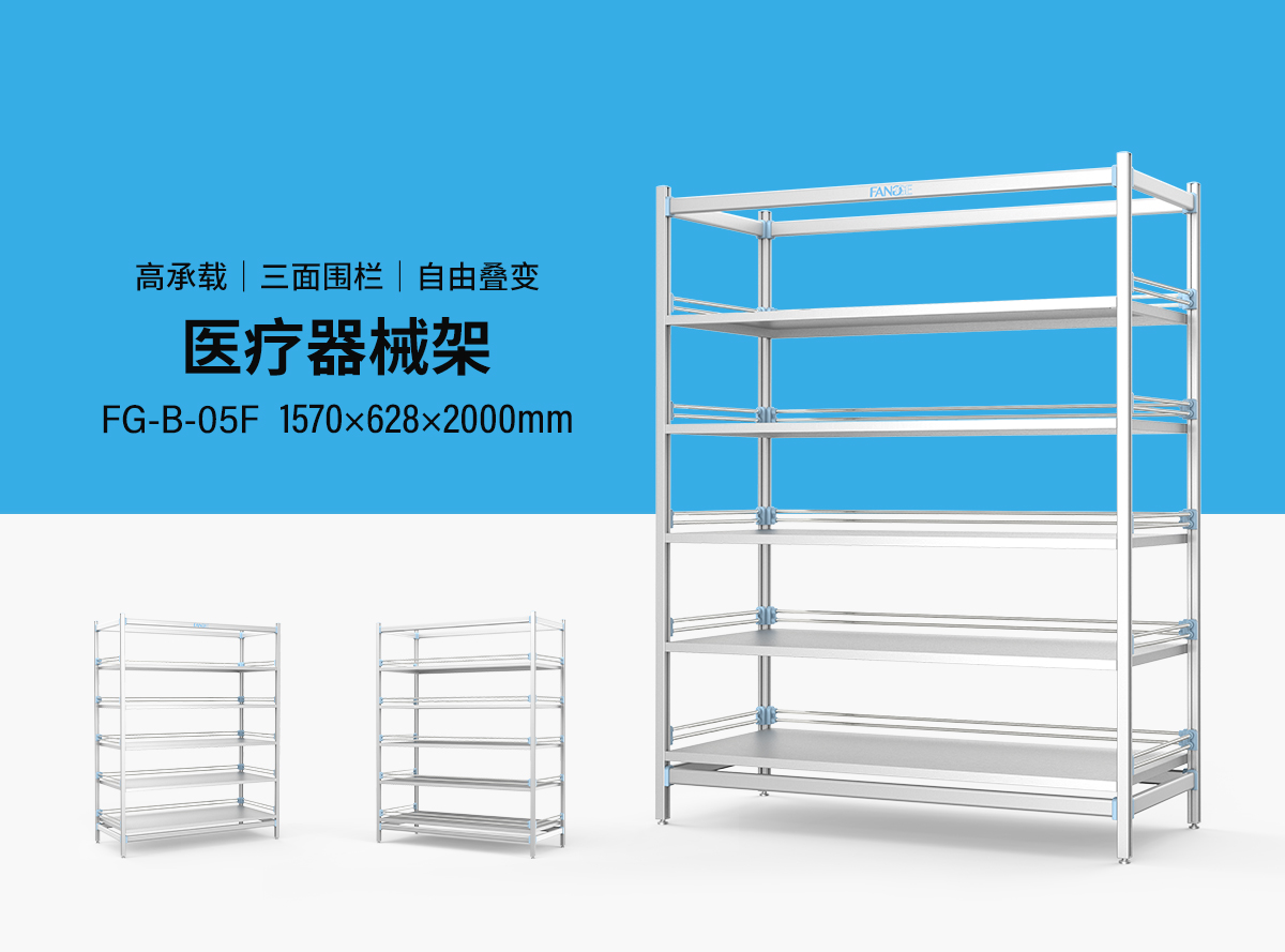 醫療器械架以陽極氧化鋁無孔框架+ABS抗沖擊卡扣為核心,集成304不銹鋼活動層板及三面雙管圍欄;可調地腳±20mm精準調平,適配復雜地面,活動層板靈活適配器械尺寸,全維度客制化滿足醫療場景高承重、防滑落及嚴苛院感管控需求。