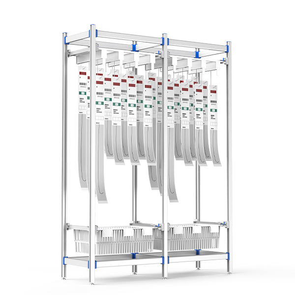 介入導管架以陽極氧化鋁無孔框架+ABS抗沖擊卡扣為核心,八列階梯式不銹鋼掛鉤支持超量導管分層懸掛;2°微傾抽拉+多維標示系統實現術中毫秒級定位,可調地腳±20mm適配復雜地面,全維度客制化滿足導管防菌防潮、高密度分類及介入手術嚴苛環境需求。