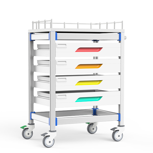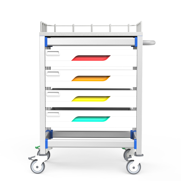 送藥推車以陽極氧化鋁無孔框架+ABS抗沖擊卡扣為核心,集成四層抽屜(三段無極間隔+靜音緩沖滑軌)與模塊化九宮格分裝系統;醫用腳輪雙剎車定向穩控+臺面三面圍欄防滑落,適配高頻靜音移動場景,全維度客制化滿足藥品防菌分揀、精準配送及嚴苛院感管控需求。