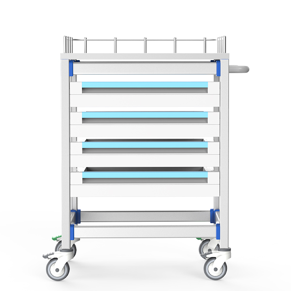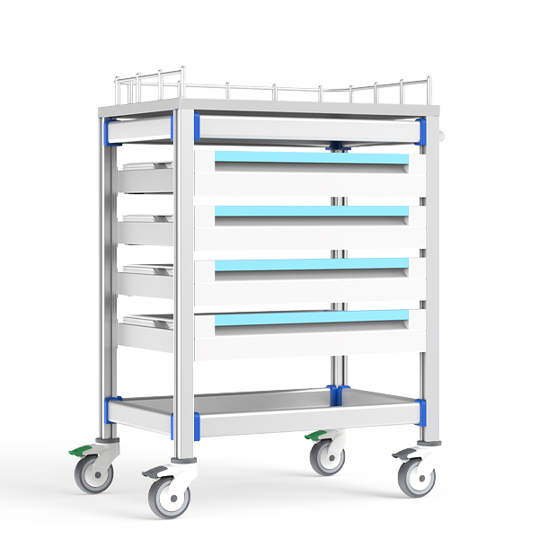 功能耗材推車以陽極氧化鋁無孔框架+ABS抗沖擊卡扣為核心,集成四層抽屜(自由插片20格分裝+透明標簽框靈活標識)與靜音緩沖滑軌系統;醫用腳輪雙剎車穩控+三面圍欄防滑落,適配高頻靜音移動場景,全維度客制化滿足耗材防菌分揀、精準定位及嚴苛院感管控需求。
