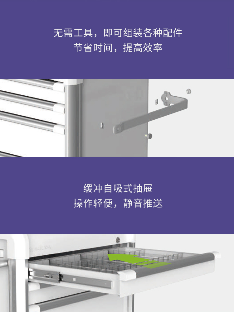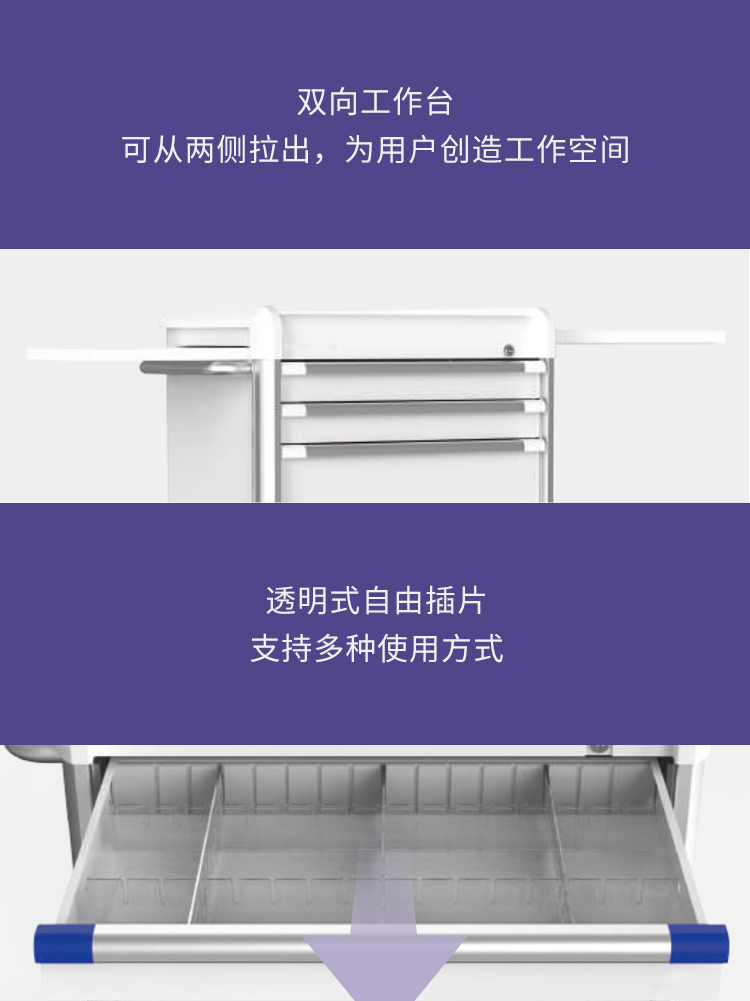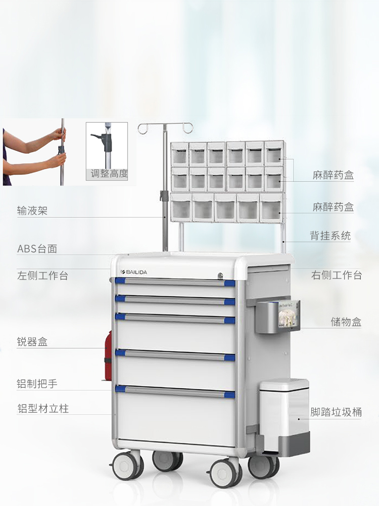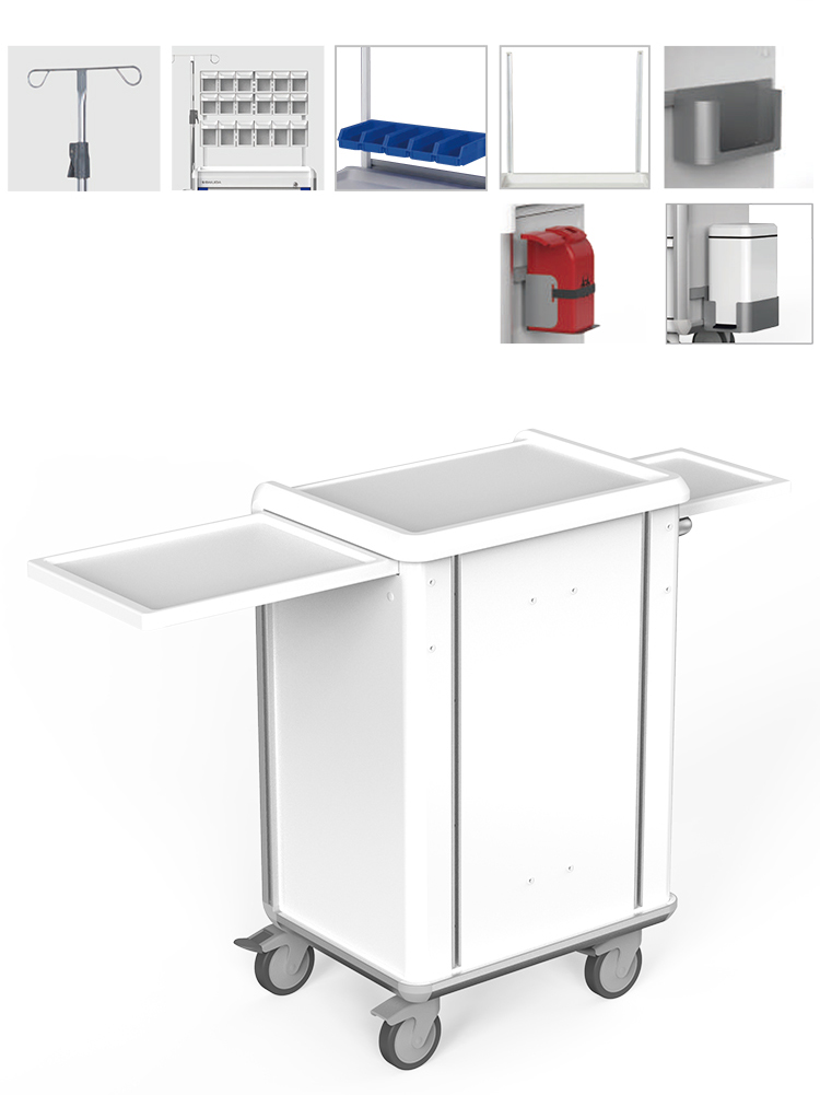 14.可選配件:污物桶、急救鎖片、按壓式輸液架、銳器盒,配件無需工具安裝,省時省力 ;