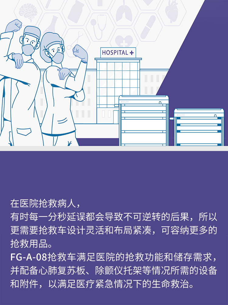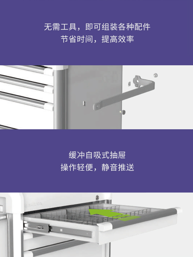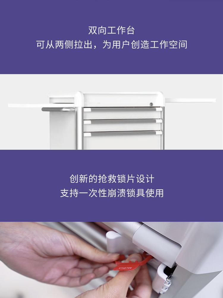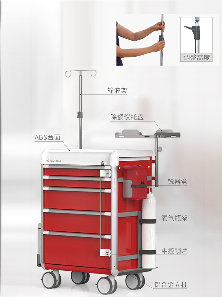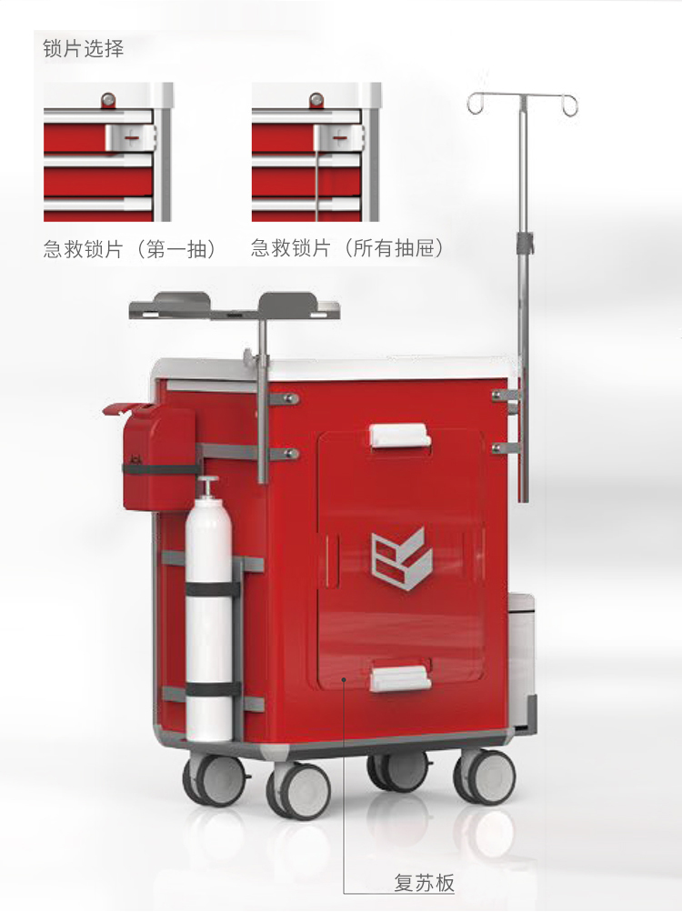13.可選配件:污物桶、急救鎖片、按壓式輸液架、心肺復蘇板、除顫儀托盤、銳器盒、氧氣瓶架,配件無需工具安裝,省時省力;