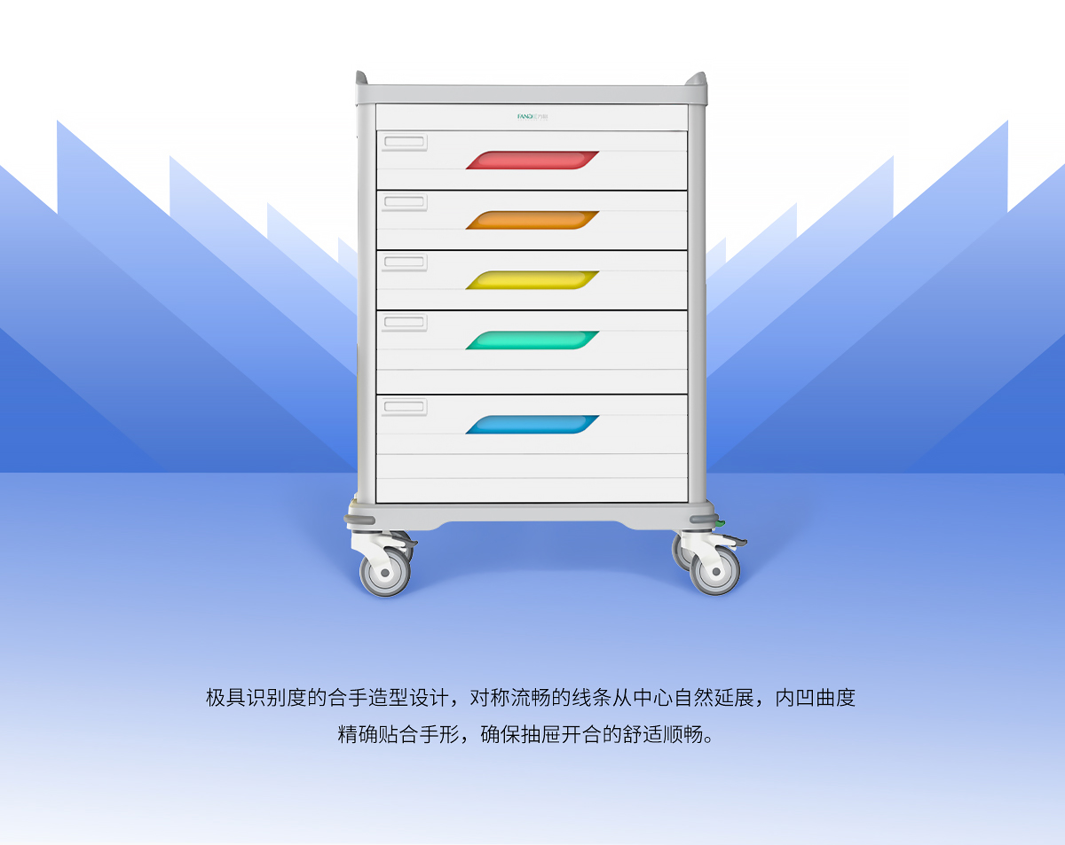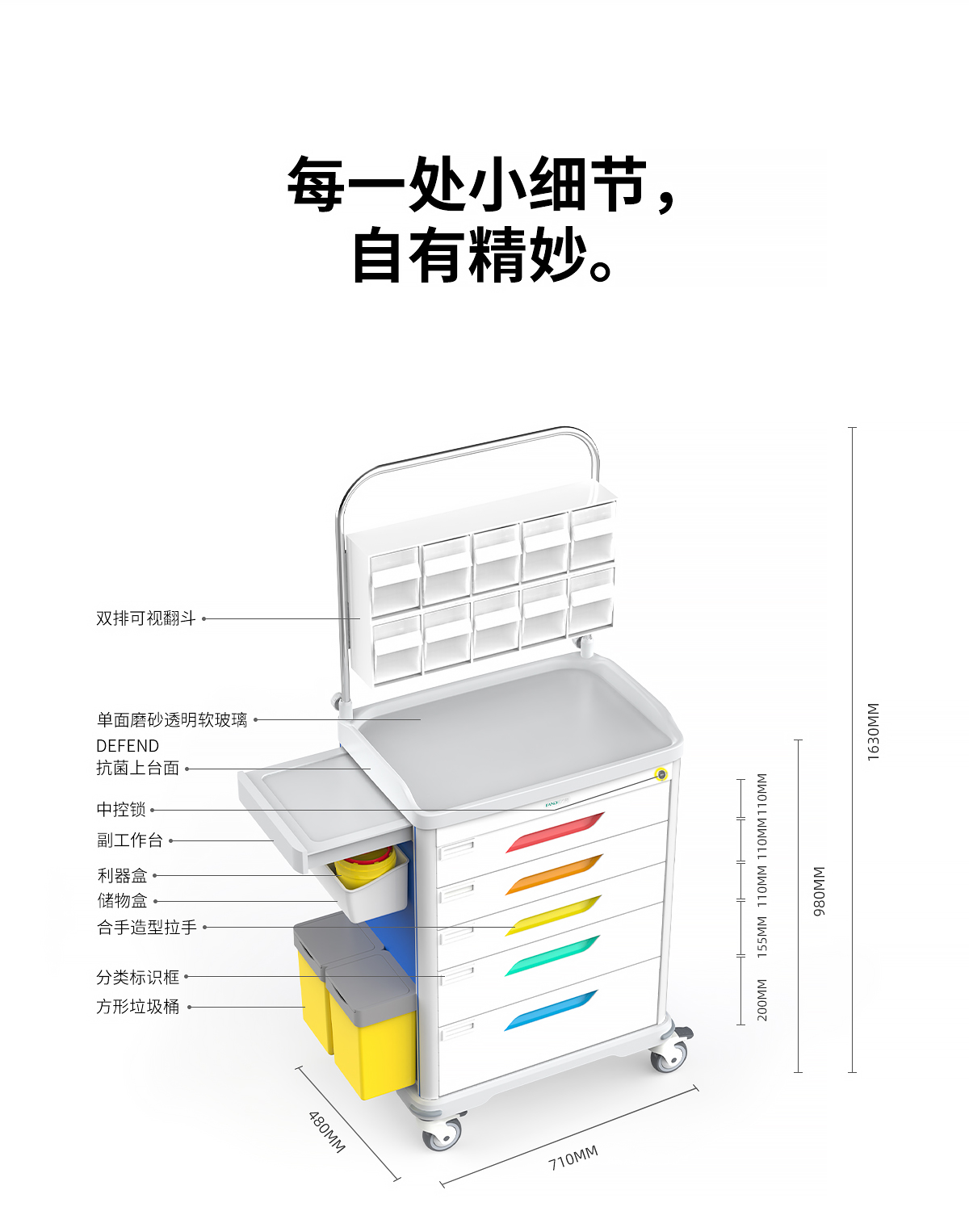 7.五層抽屜設計,三個淺抽屜面高度110MM,一個中抽屜面高度155MM,一個深抽屜面高度200MM,每個抽屜均配有標簽識別框;