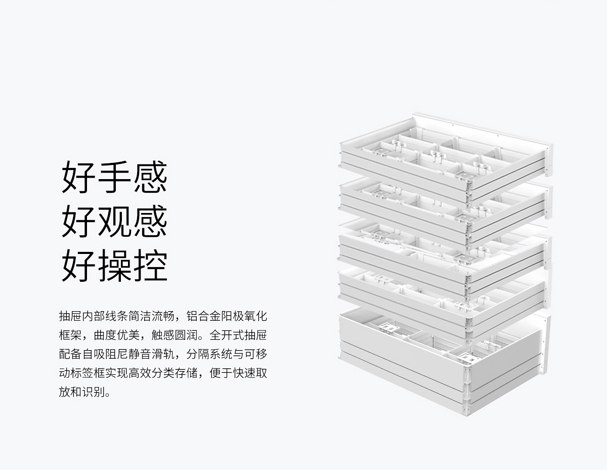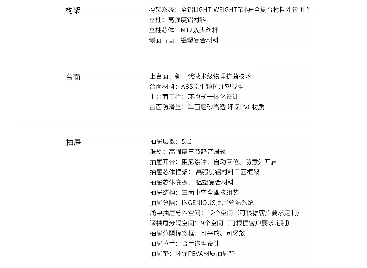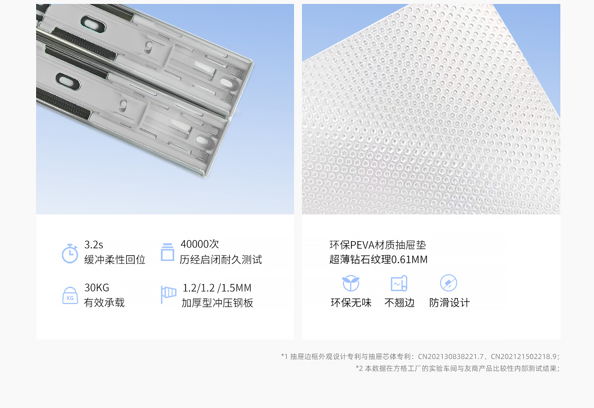 8. 抽屜芯體采用自主設計雙層鋁材框架,無棱角中空加厚,鑲嵌4MM鋁塑復合材料底板,覆蓋環保PEVA材質防滑墊;