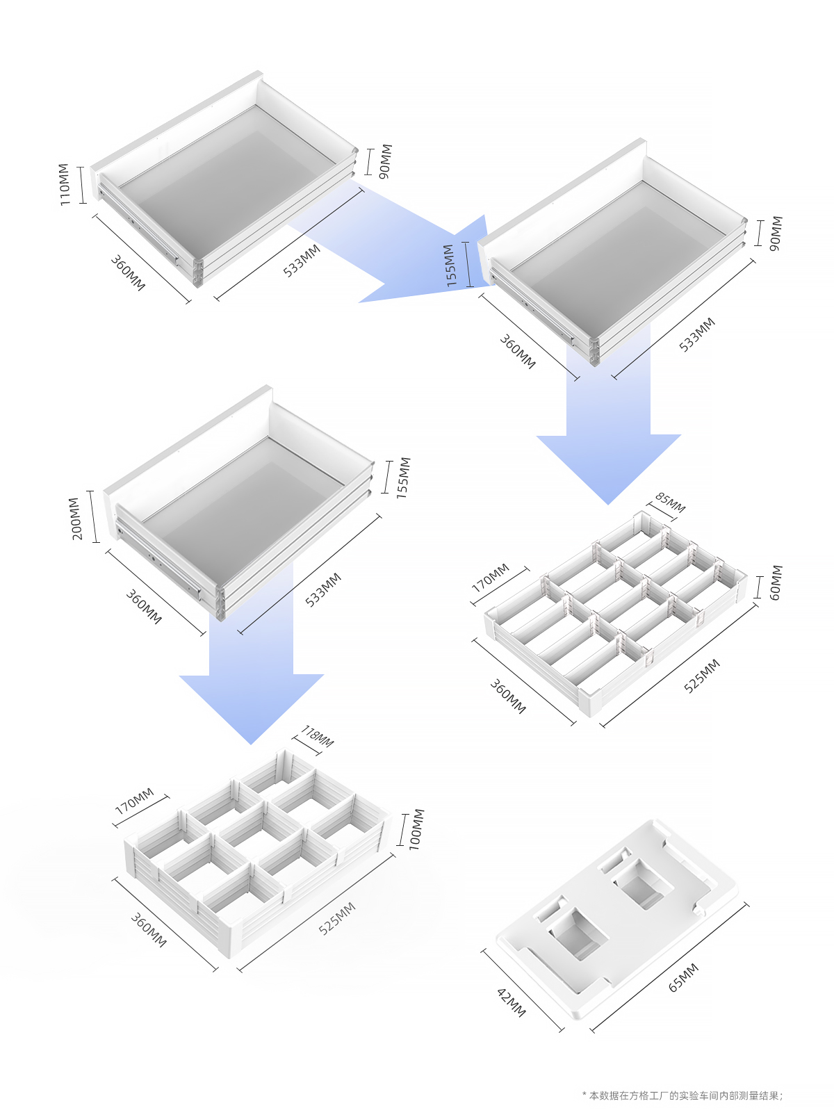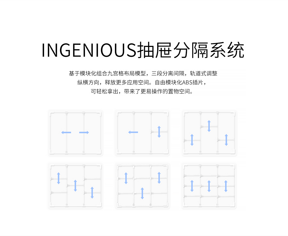 9. 標配Ingenious架構抽屜分隔系統,基于模塊化組合九宮格布局模型,三段分離無極間隔,淺中抽屜間隔高度60MM,深抽屜間隔高度100MM,軌道式調整縱橫方向,釋放更多應用空間。