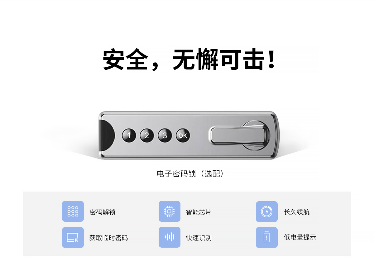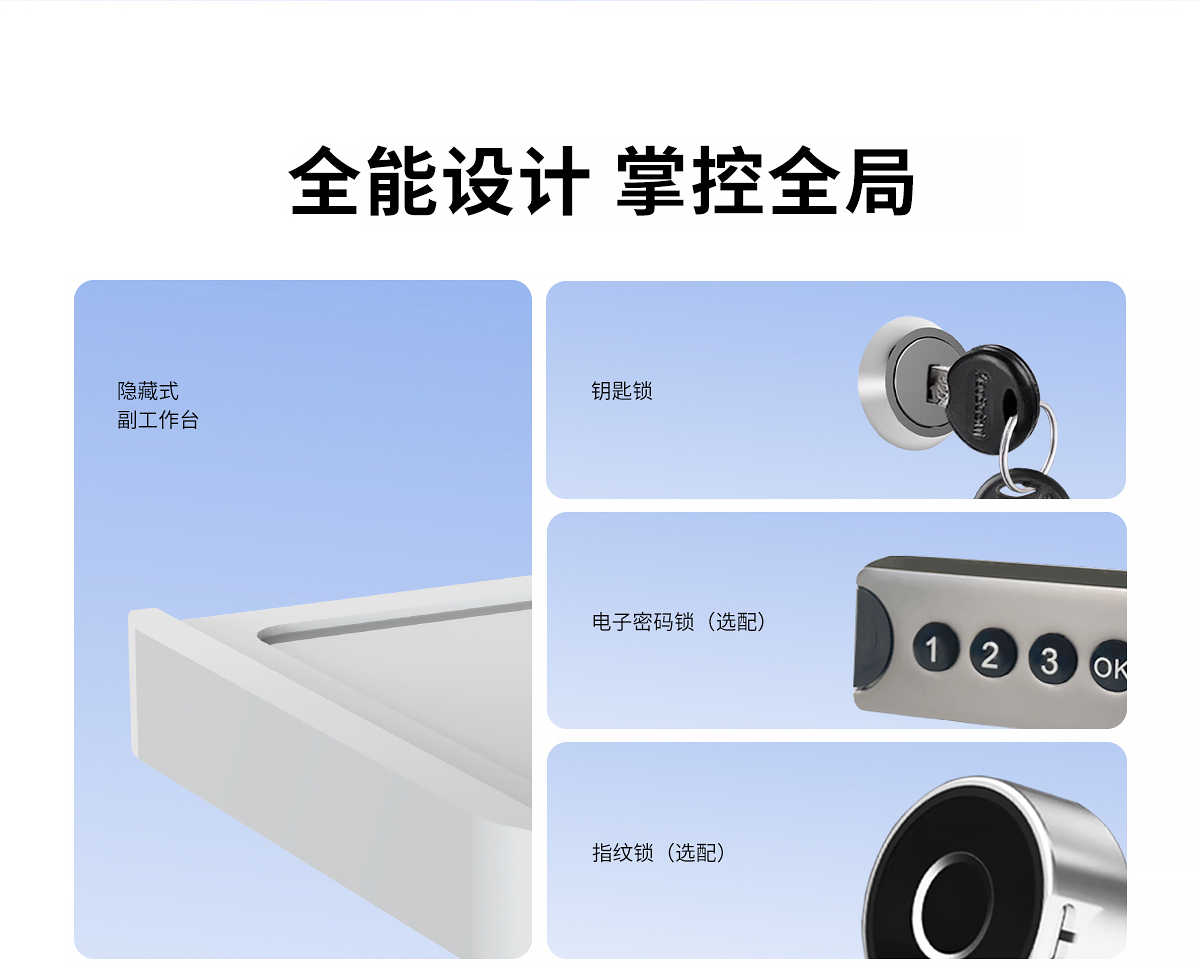 10.中控鎖控設計,特別的魚刺鎖控設計,未鎖定的抽屜可以推合鎖定;(可選配密碼鎖,指紋鎖)