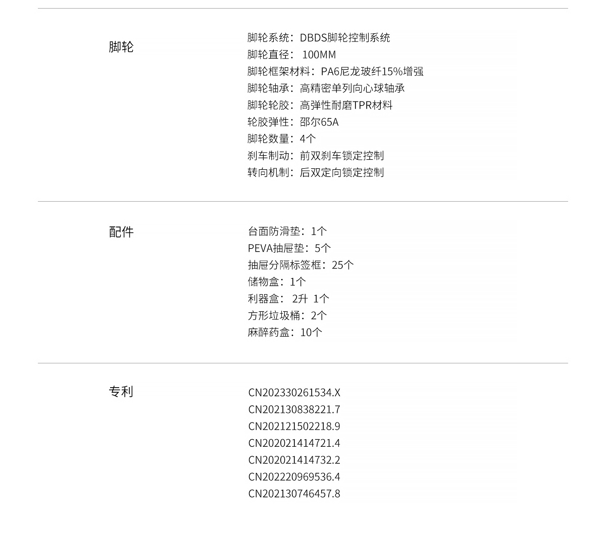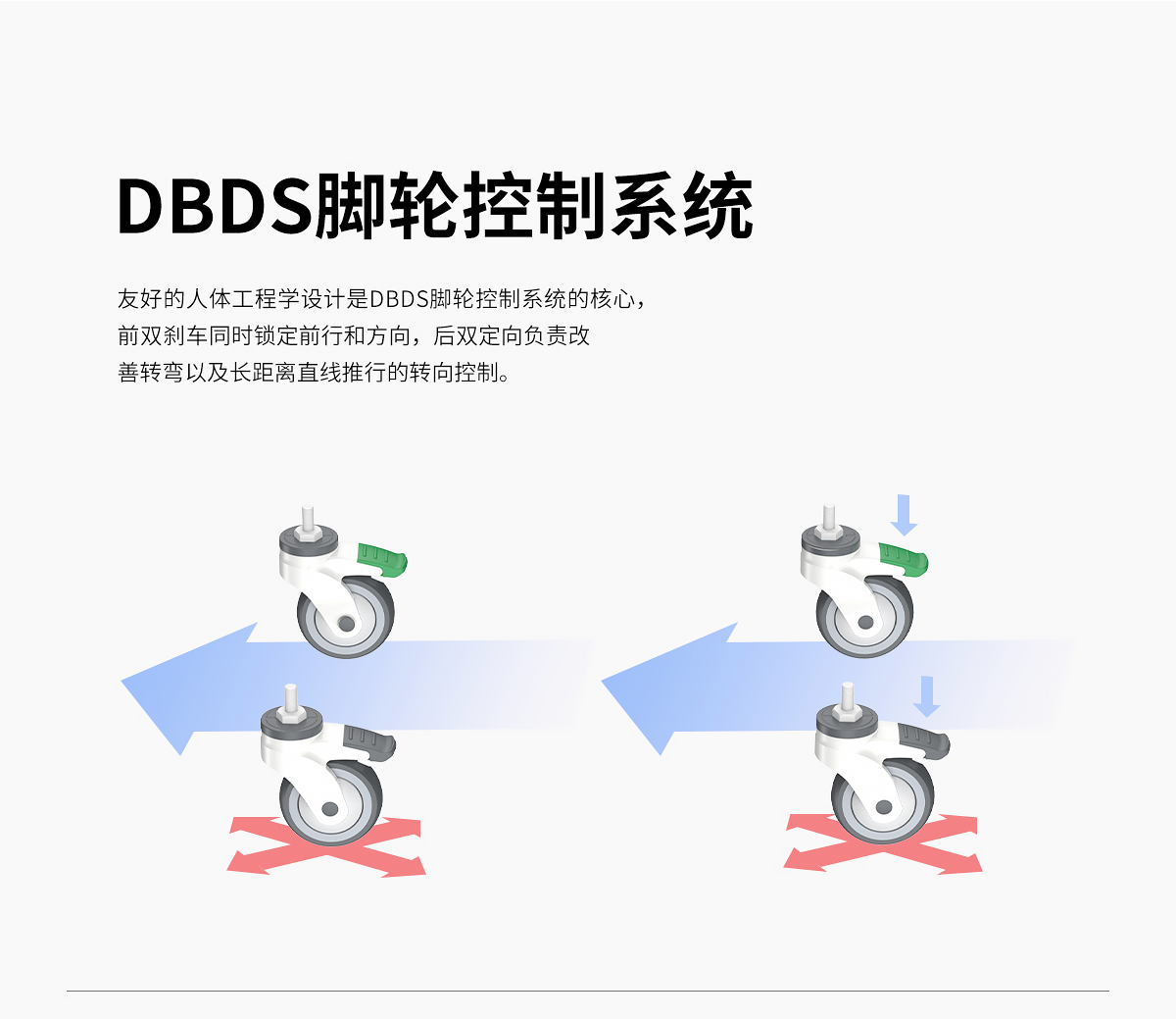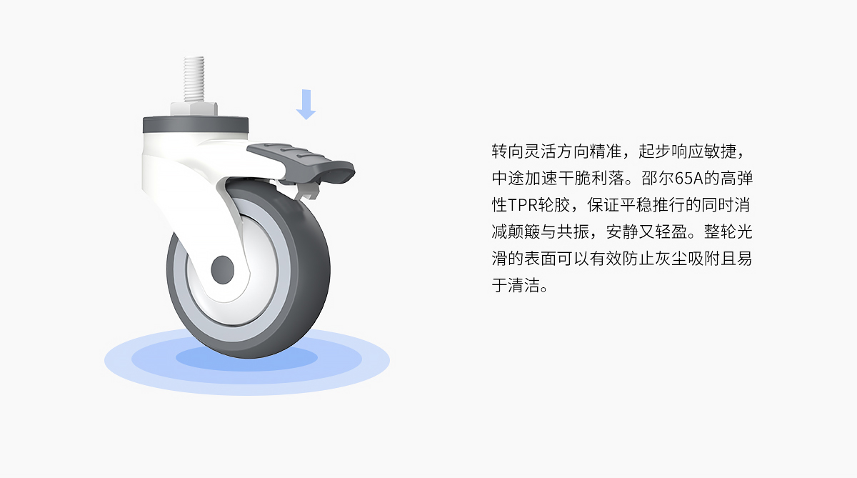 16.搭載醫用級100MM腳輪,良好的減噪減震設計,轉向靈活方向精準,直線推行平穩,每只承載50KG。易操控的雙剎車配置,輕松實現制動開合,整輪光滑的表面可以防止灰塵吸附且易于清潔;