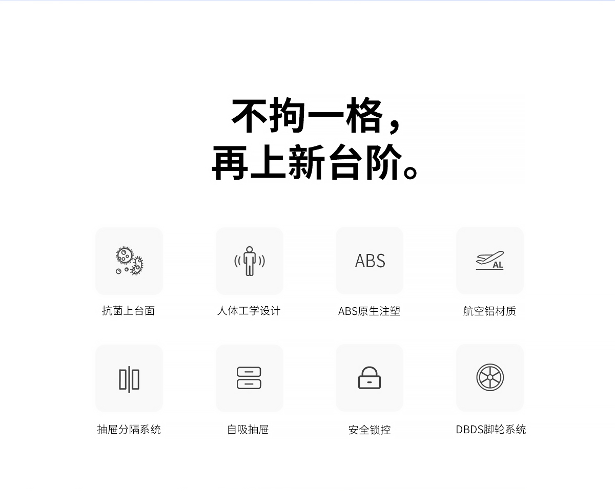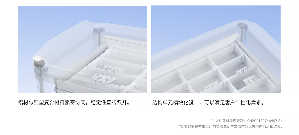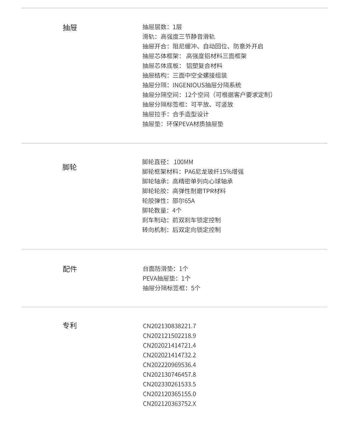 8. 抽屜芯體采用自主設計雙層鋁材框架,無棱角中空加厚,鑲嵌4MM鋁塑復合材料底板,覆蓋環保PEVA材質防滑墊;