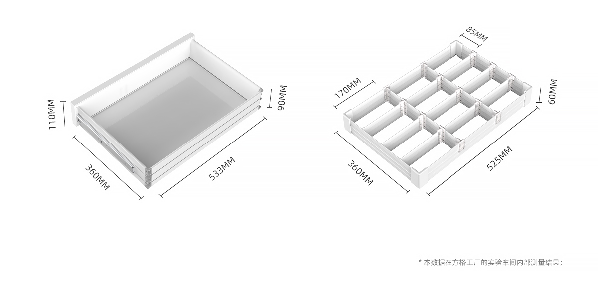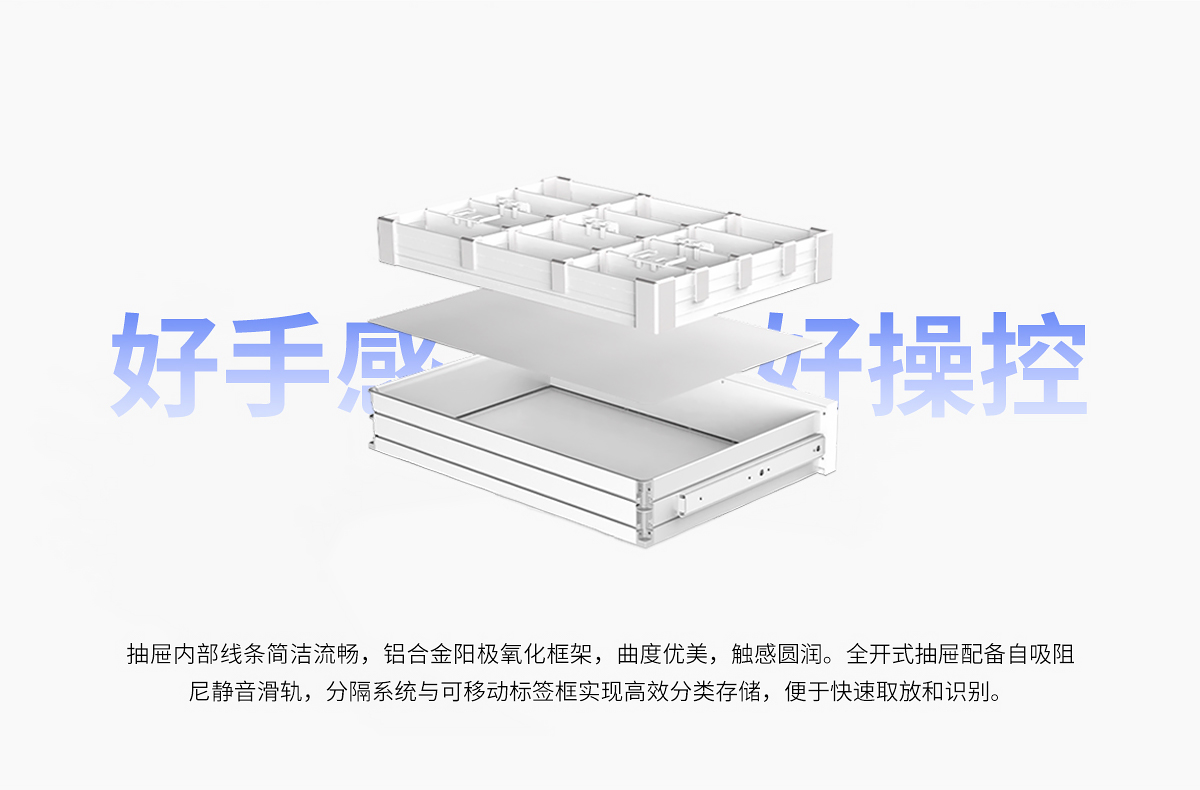 9. 標配Ingenious架構抽屜分隔系統,基于模塊化組合九宮格布局模型,三段分離無極間隔,間隔高度60MM,軌道式調整縱橫方向,釋放更多應用空間。