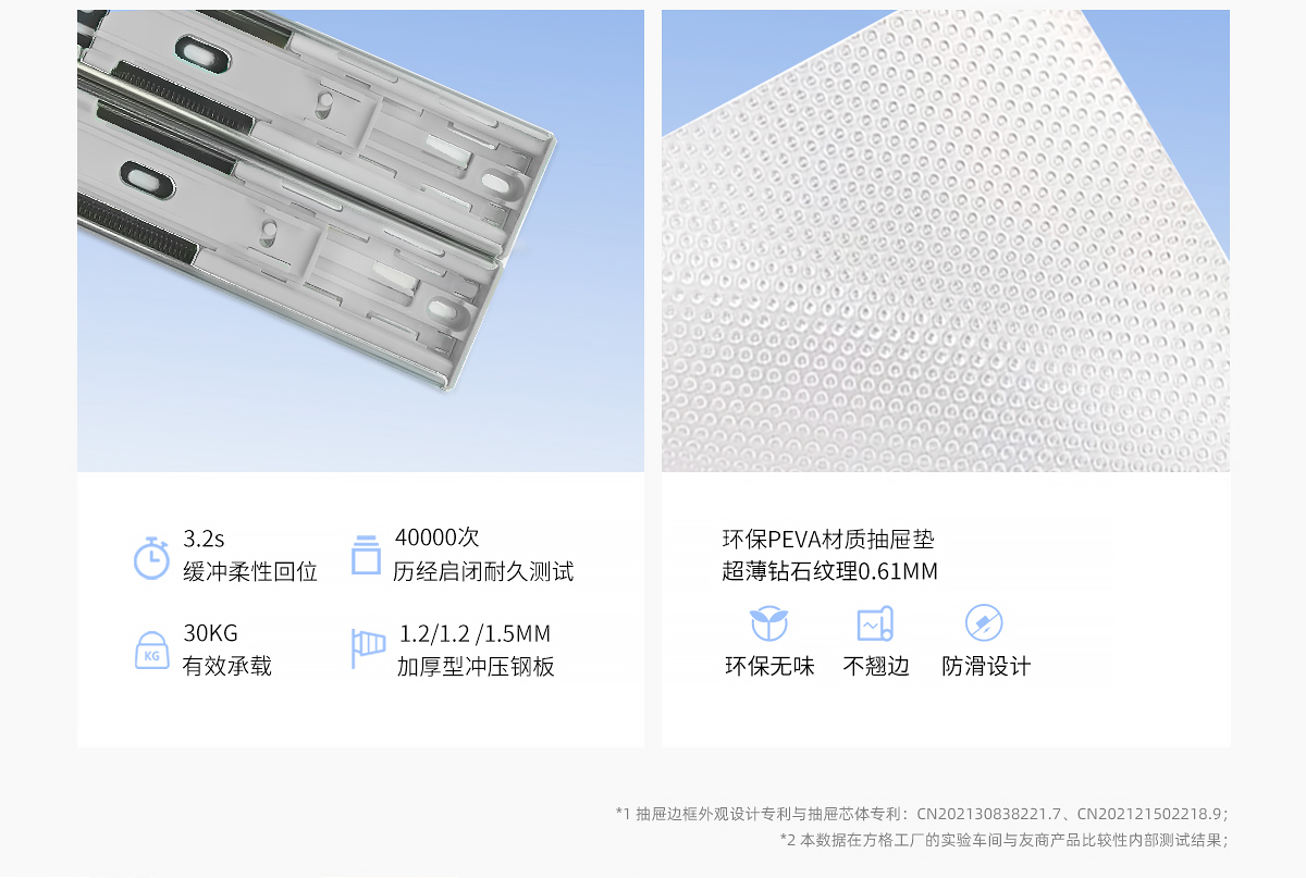 10.搭配1.2/1.2/1.5MM加厚型三節靜音緩沖滑軌系統,集成自閉阻尼模塊,開合流暢,有效承載15KG;