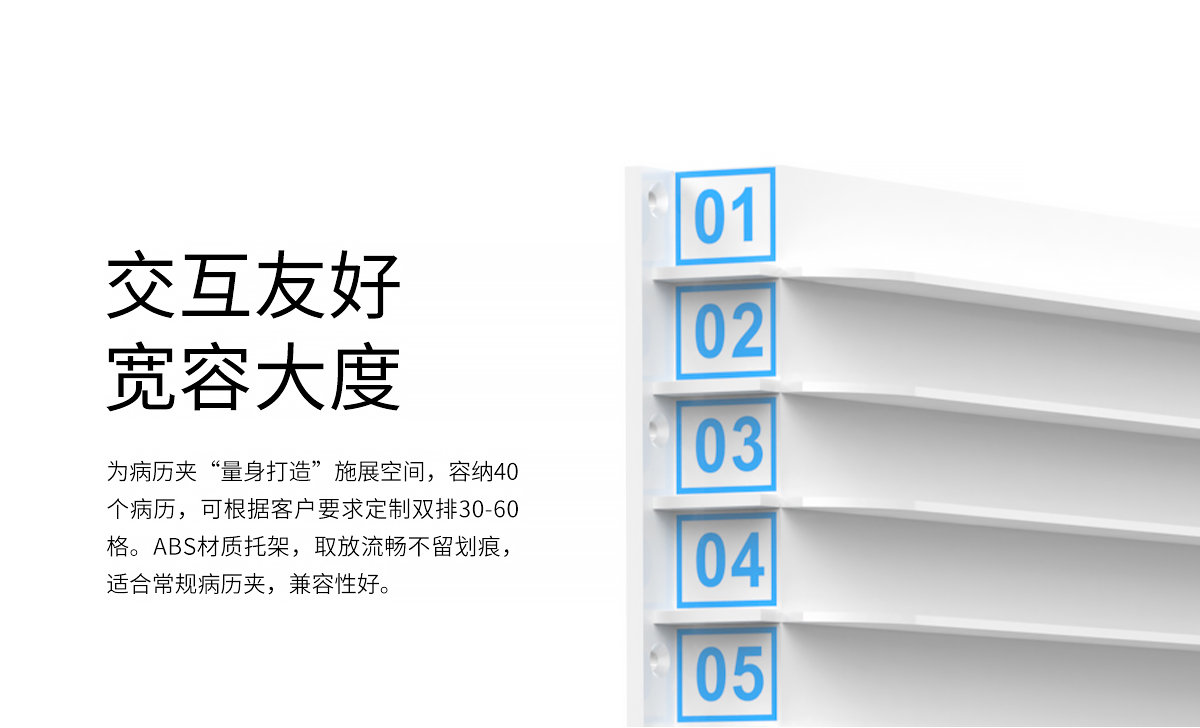 11.ABS材料病歷托架,適用常規病歷夾尺寸,可以容納40個病歷,且設有防水標識號碼,清晰識別不褪色;(可定制50格,60格)