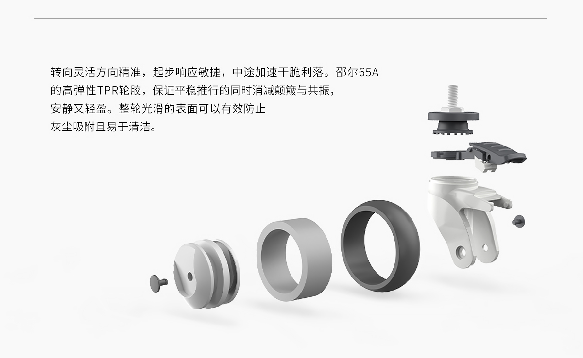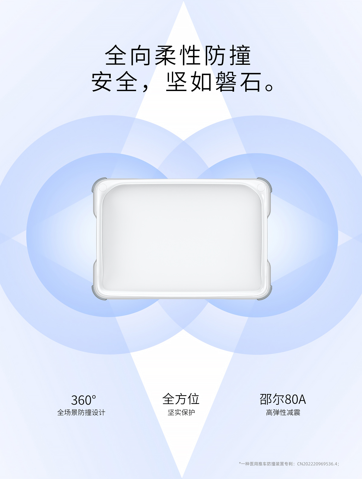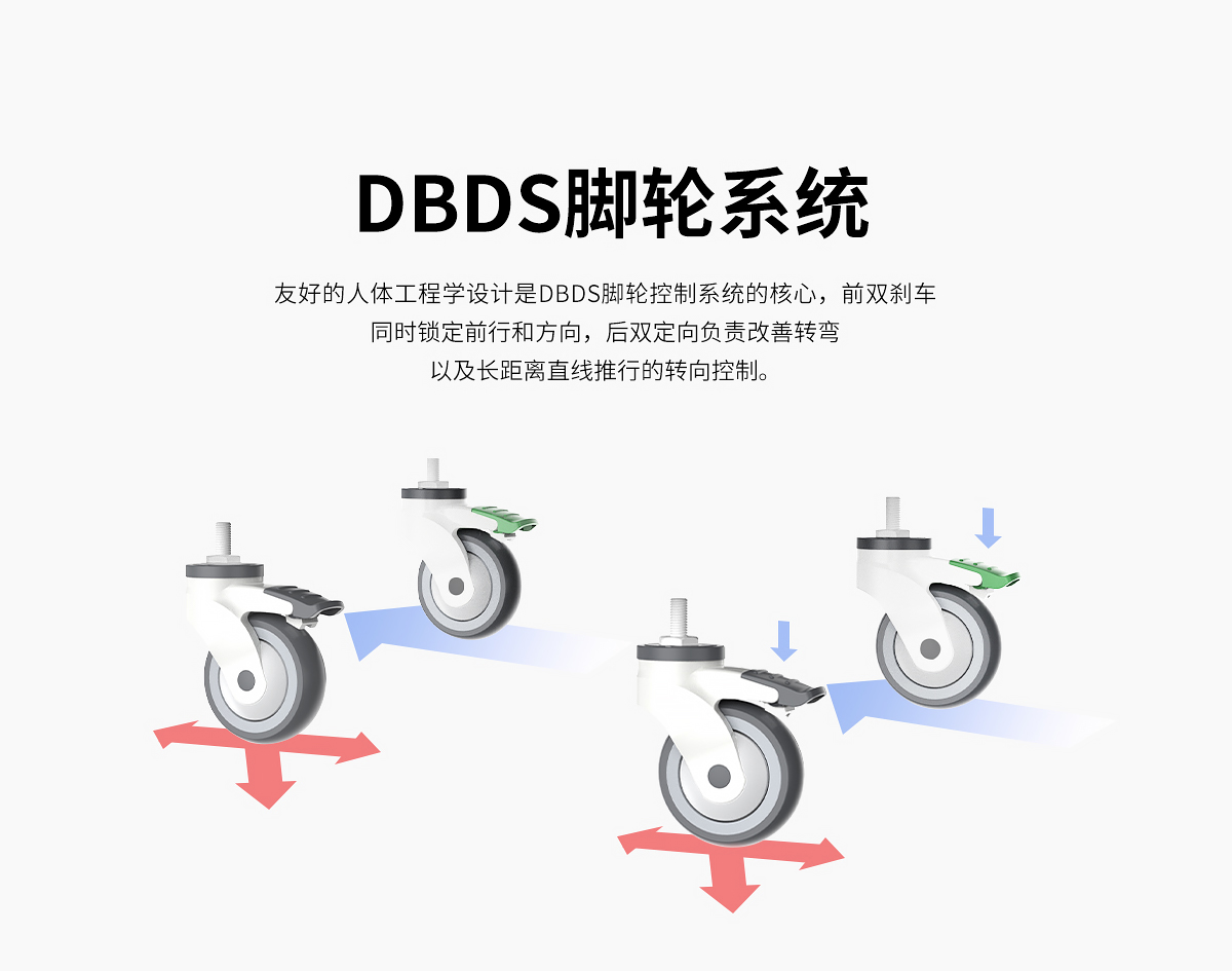 14.搭載醫用級100MM腳輪,良好的減噪減震設計,轉向靈活方向精準,直線推行平穩,每只承載50KG。易操控的雙剎車配置,輕松實現制動開合,整輪光滑的表面可以防止灰塵吸附且易于清潔;