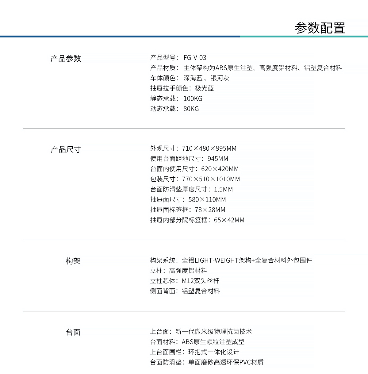 2.上下臺面采用ABS工程原生塑料注塑成型,上臺面配置單面磨砂1.5MM厚度軟玻璃,防止物品在臺面滑行;