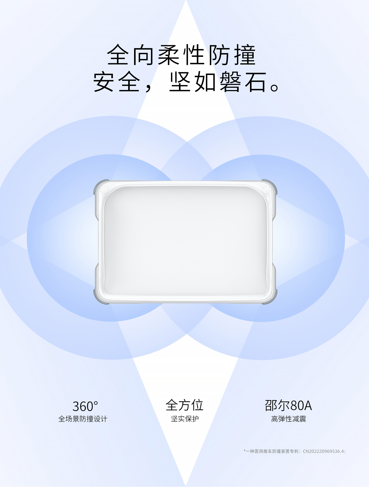 14.國家專利360°柔性防撞吸能設計,當發生外力撞擊時,沖擊力通過高彈性減震耐磨材料吸收,分解并消散,使車身保持穩定安全;