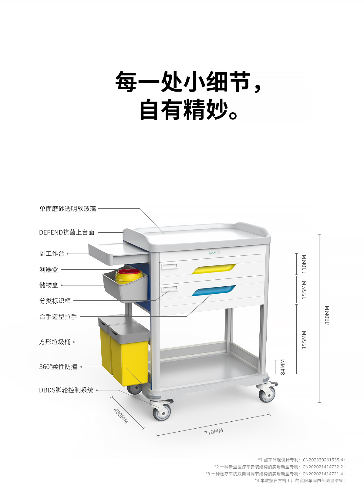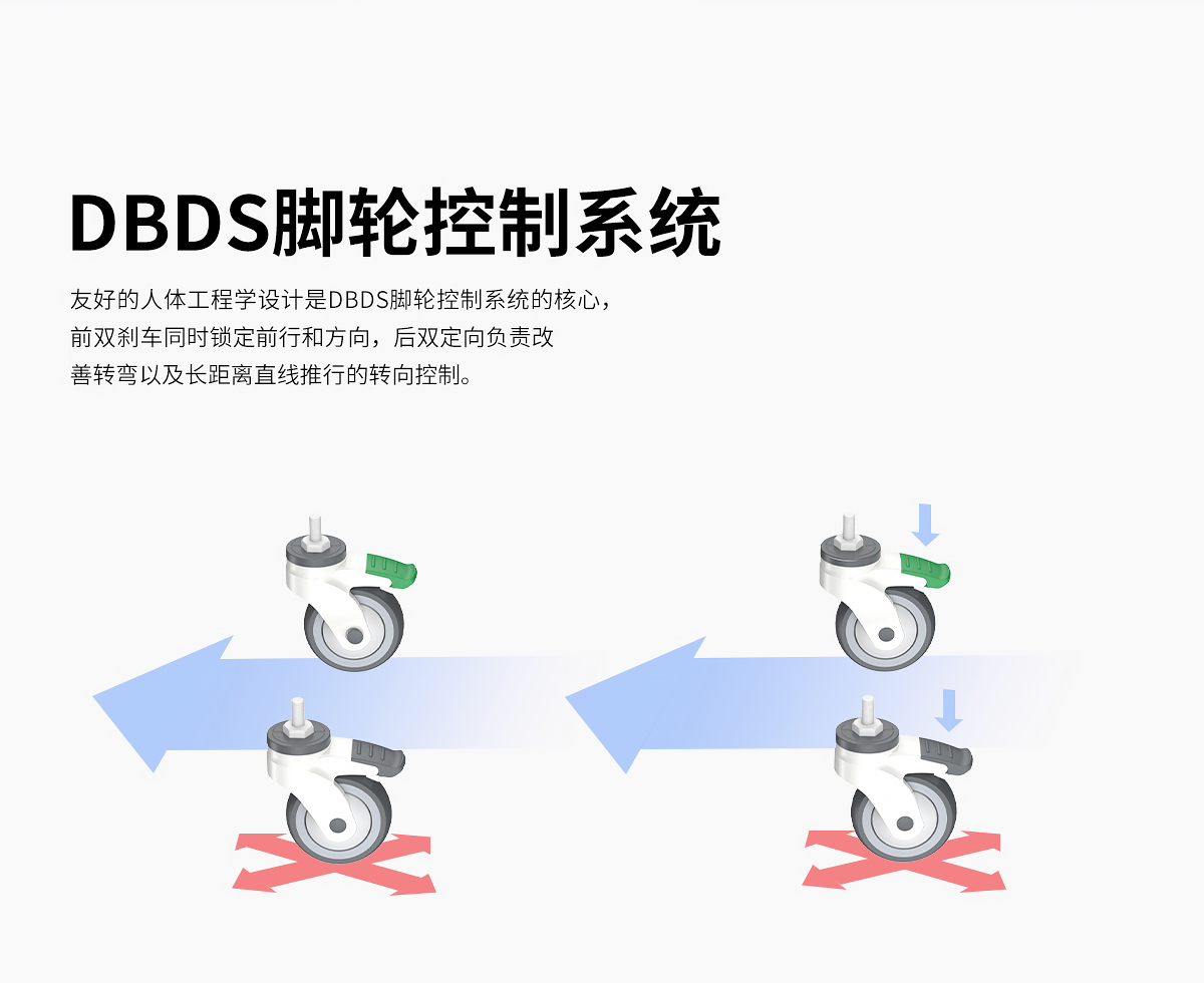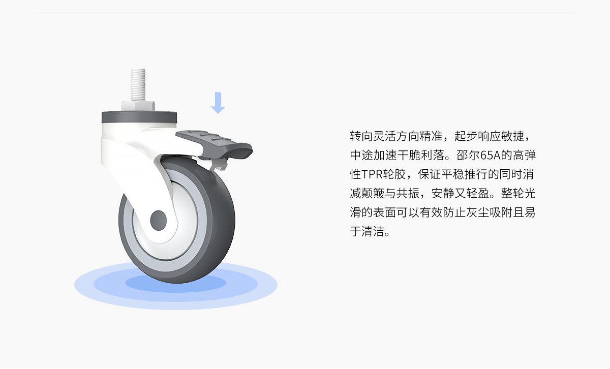 15.搭載醫用級100MM腳輪,良好的減噪減震設計,轉向靈活方向精準,直線推行平穩,每只承載50KG。易操控的雙剎車配置,輕松實現制動開合,整輪光滑的表面可以防止灰塵吸附且易于清潔;