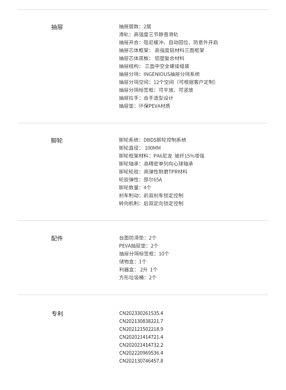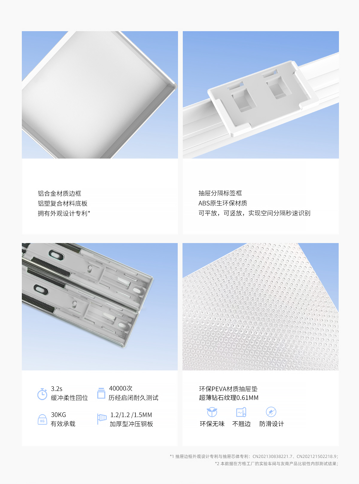 9. 抽屜芯體采用自主設計雙層鋁材框架,無棱角中空加厚,鑲嵌4MM鋁塑復合材料底板,覆蓋環保PEVA材質防滑墊;