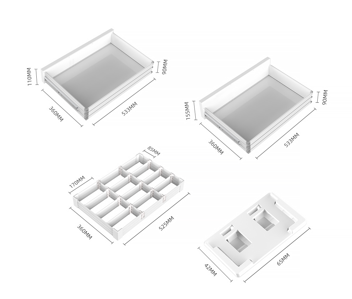 10. 標配Ingenious架構抽屜分隔系統,基于模塊化組合九宮格布局模型,三段分離無極間隔,淺中抽屜間隔高度60MM,軌道式調整縱橫方向,釋放更多應用空間。