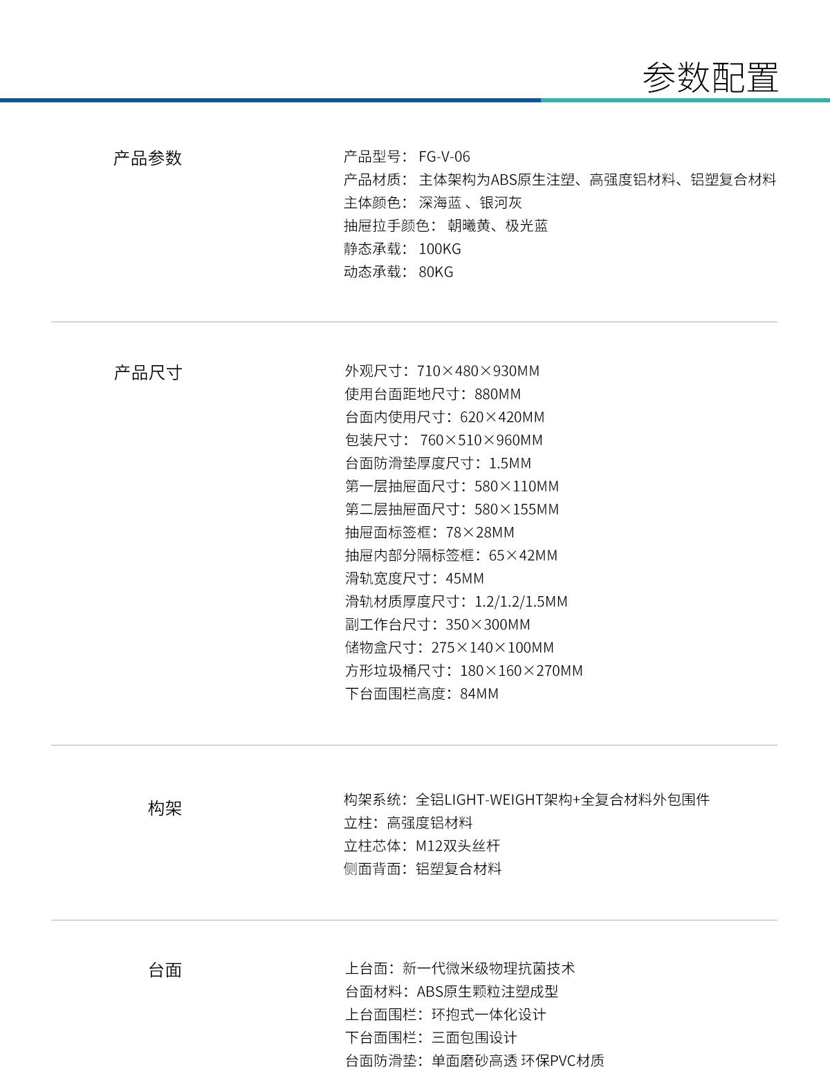 2.上下臺面采用ABS工程原生塑料注塑成型,上下臺面配置單面磨砂1.5MM厚度軟玻璃,防止物品在臺面滑行;