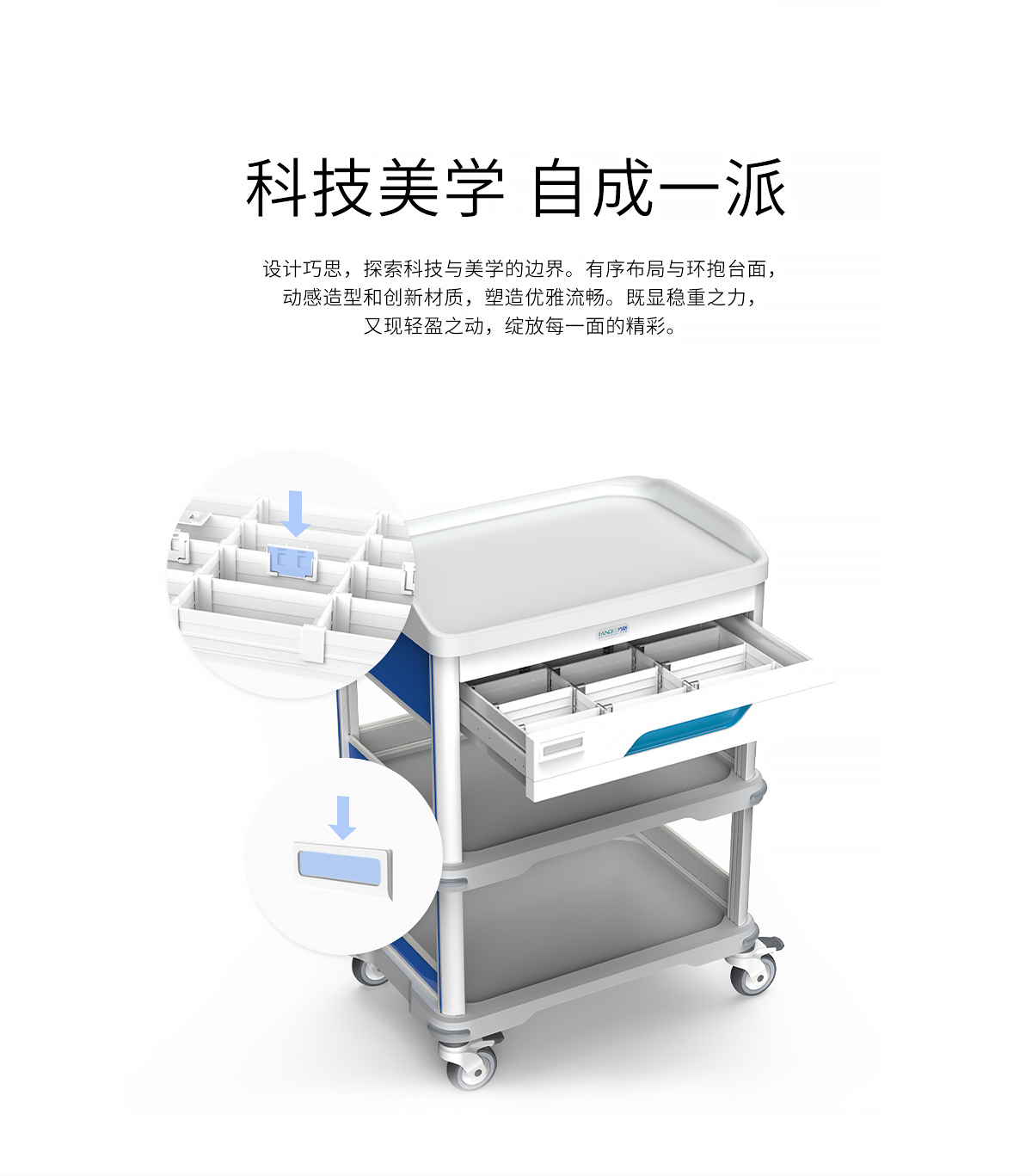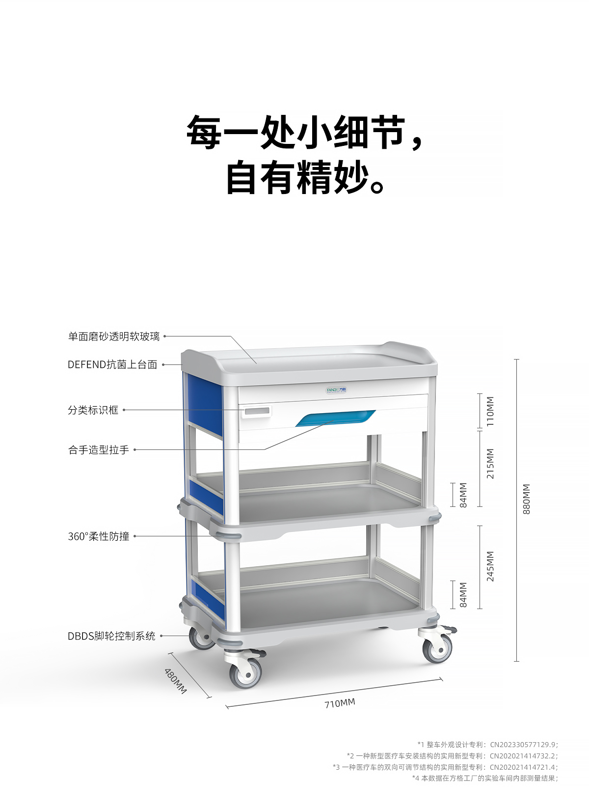 14.搭載醫用級100MM腳輪,良好的減噪減震設計,轉向靈活方向精準,直線推行平穩,每只承載50KG。易操控的雙剎車配置,輕松實現制動開合,整輪光滑的表面可以防止灰塵吸附且易于清潔;