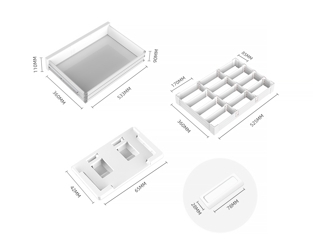 10. 標配Ingenious架構抽屜分隔系統,基于模塊化組合九宮格布局模型,三段分離無極間隔,淺抽屜間隔高度60MM,軌道式調整縱橫方向,釋放更多應用空間。