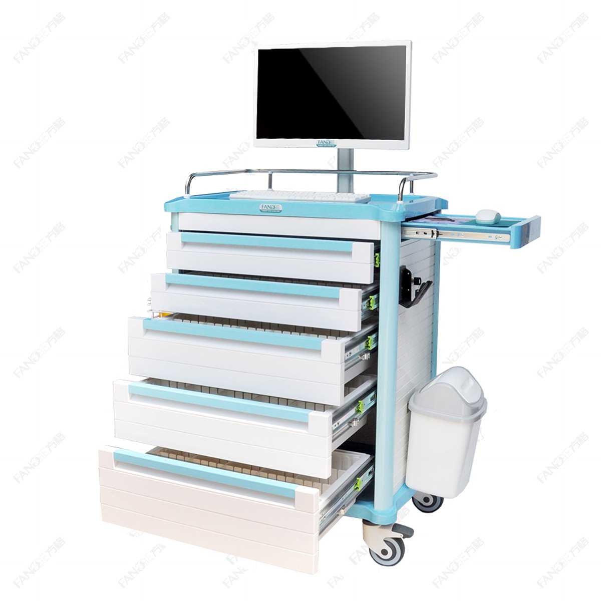 9.安全中控鎖,可同時鎖定全部抽屜,有效保護物品安全;10.車體一側上方懸掛浸塑網籃,可放置洗手液桶、銳器桶;下方配備垃圾桶,可輕松摘離;