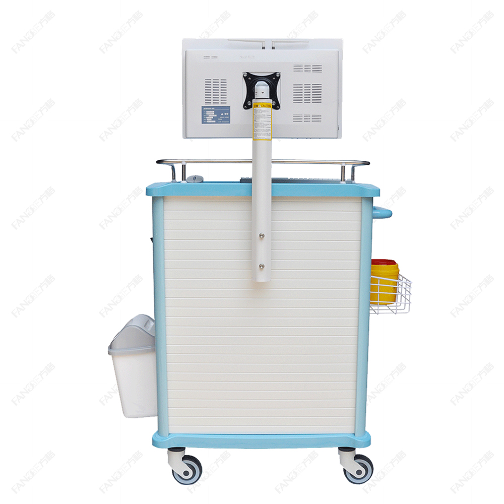 1.臺面采用臺灣奇美ABS顆粒純料注塑成型,配置透明軟玻璃,方便清理。ABS材質凹形臺面有效防止物品在臺面滑行,強度高、色澤飽滿契合醫護使用環境;