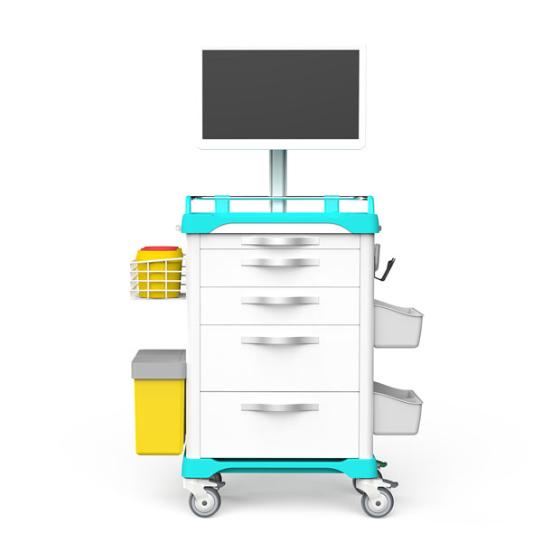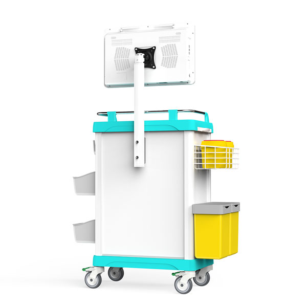 10.車體左側上方懸掛浸塑網籃,可放置洗手液桶、銳器桶;下方配備垃圾桶,可輕松摘離;