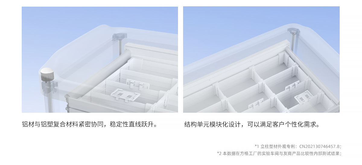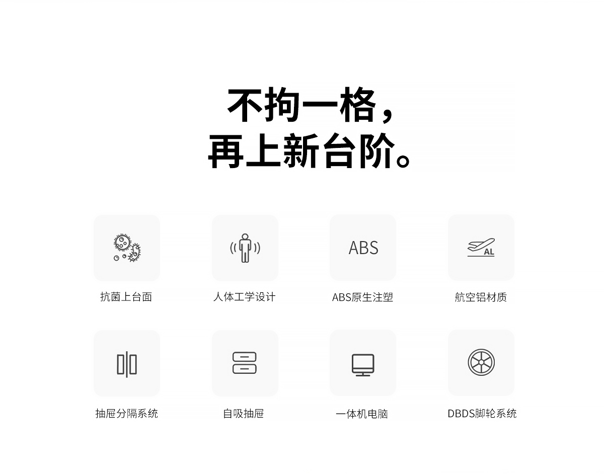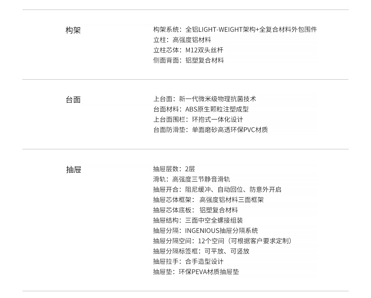 9. 抽屜芯體采用自主設計雙層鋁材框架,無棱角中空加厚,鑲嵌4MM鋁塑復合材料底板,覆蓋環保EPVA材質防滑墊;