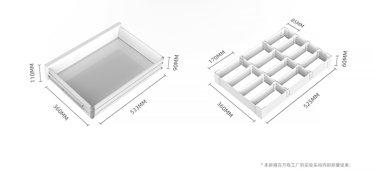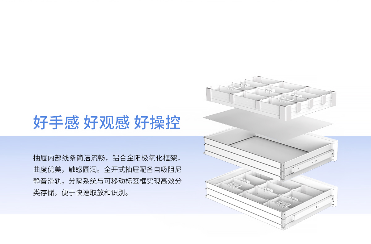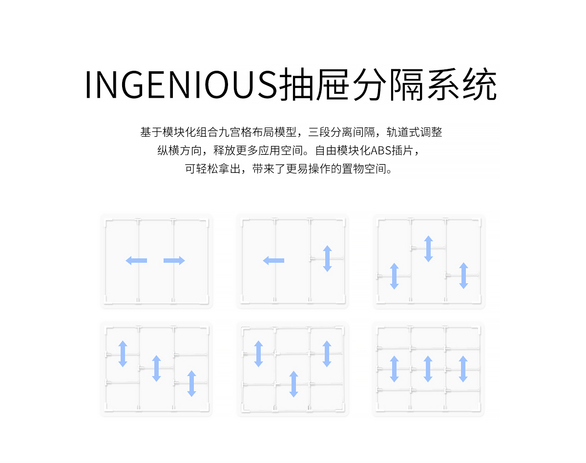 10. 標配Ingenious架構抽屜分隔系統,基于模塊化組合九宮格布局模型,三段分離無極間隔,抽屜間隔高度60MM,可以間隔出12格,軌道式調整縱橫方向,釋放更多應用空間。