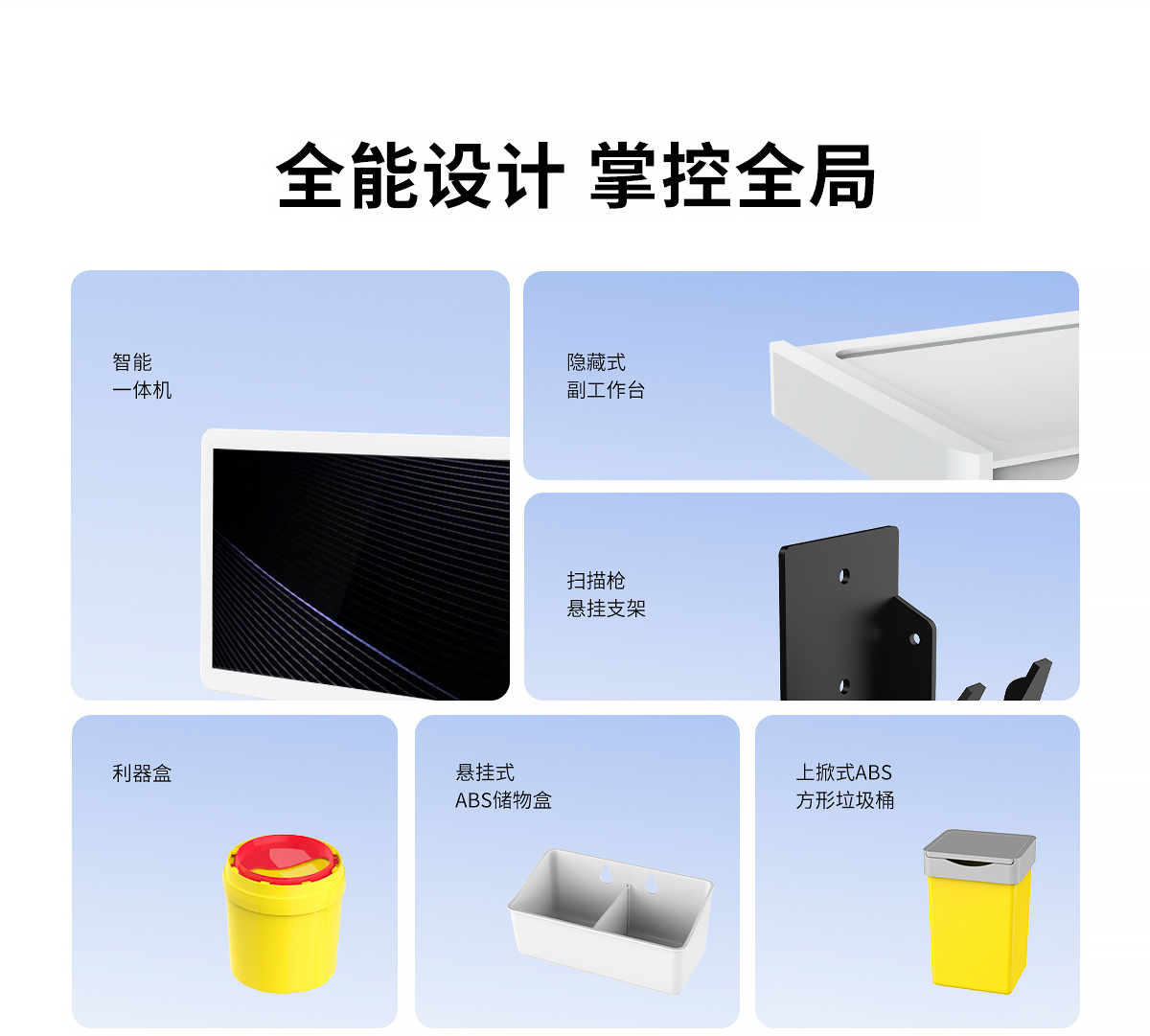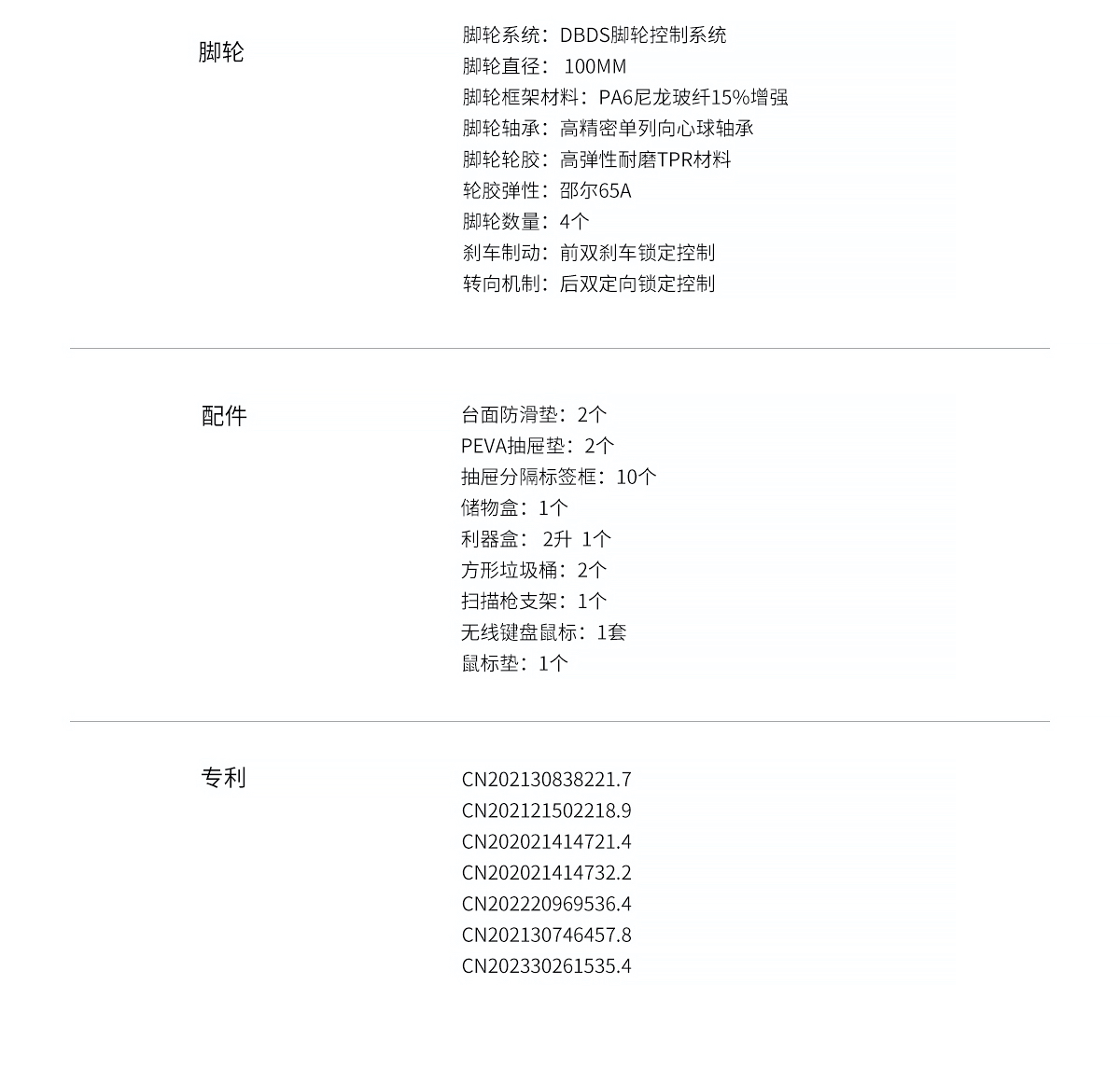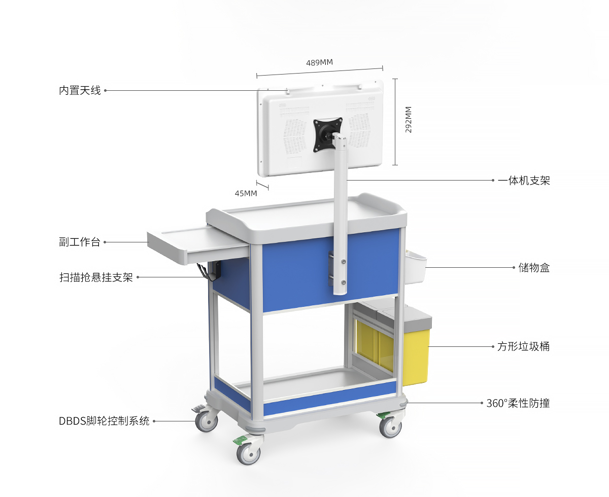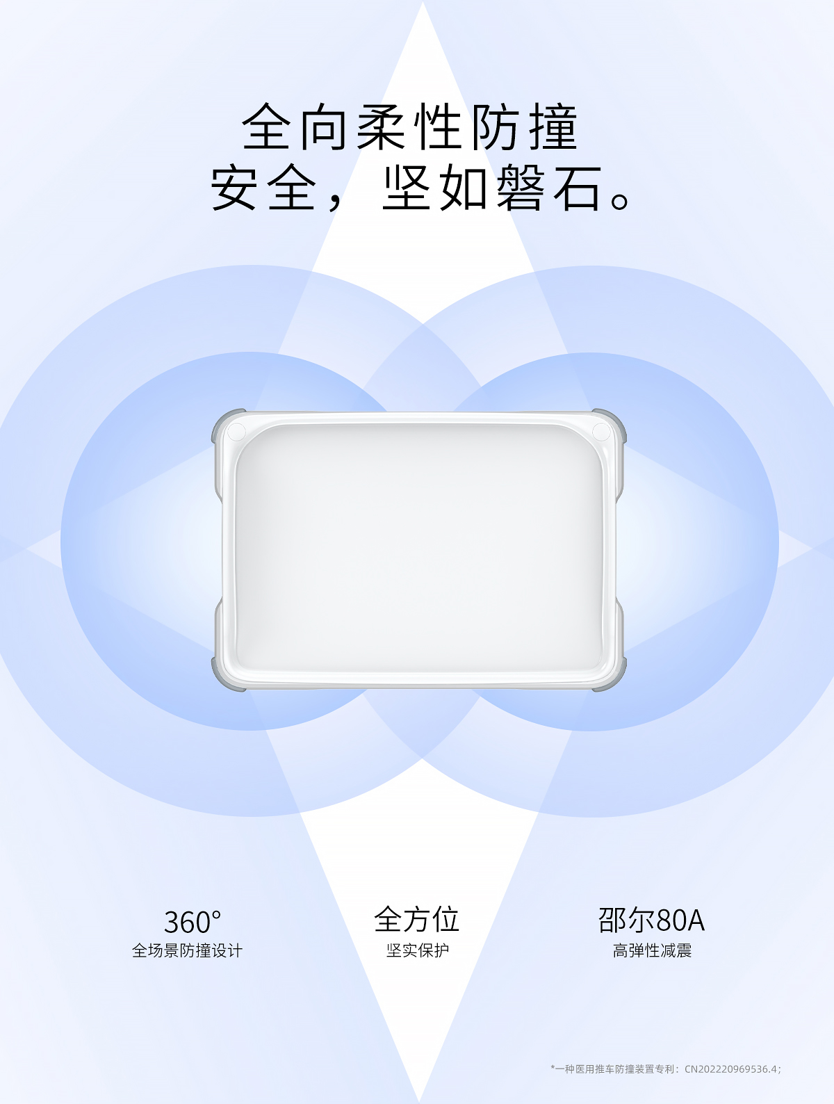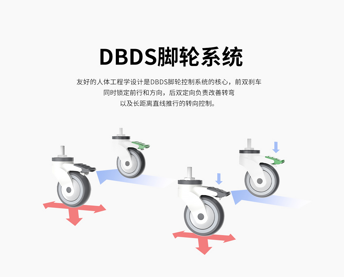 16.搭載醫用級100MM腳輪,良好的減噪減震設計,轉向靈活方向精準,直線推行平穩,每只承載50KG。易操控的雙剎車配置,輕松實現制動開合,整輪光滑的表面可以防止灰塵吸附且易于清潔;